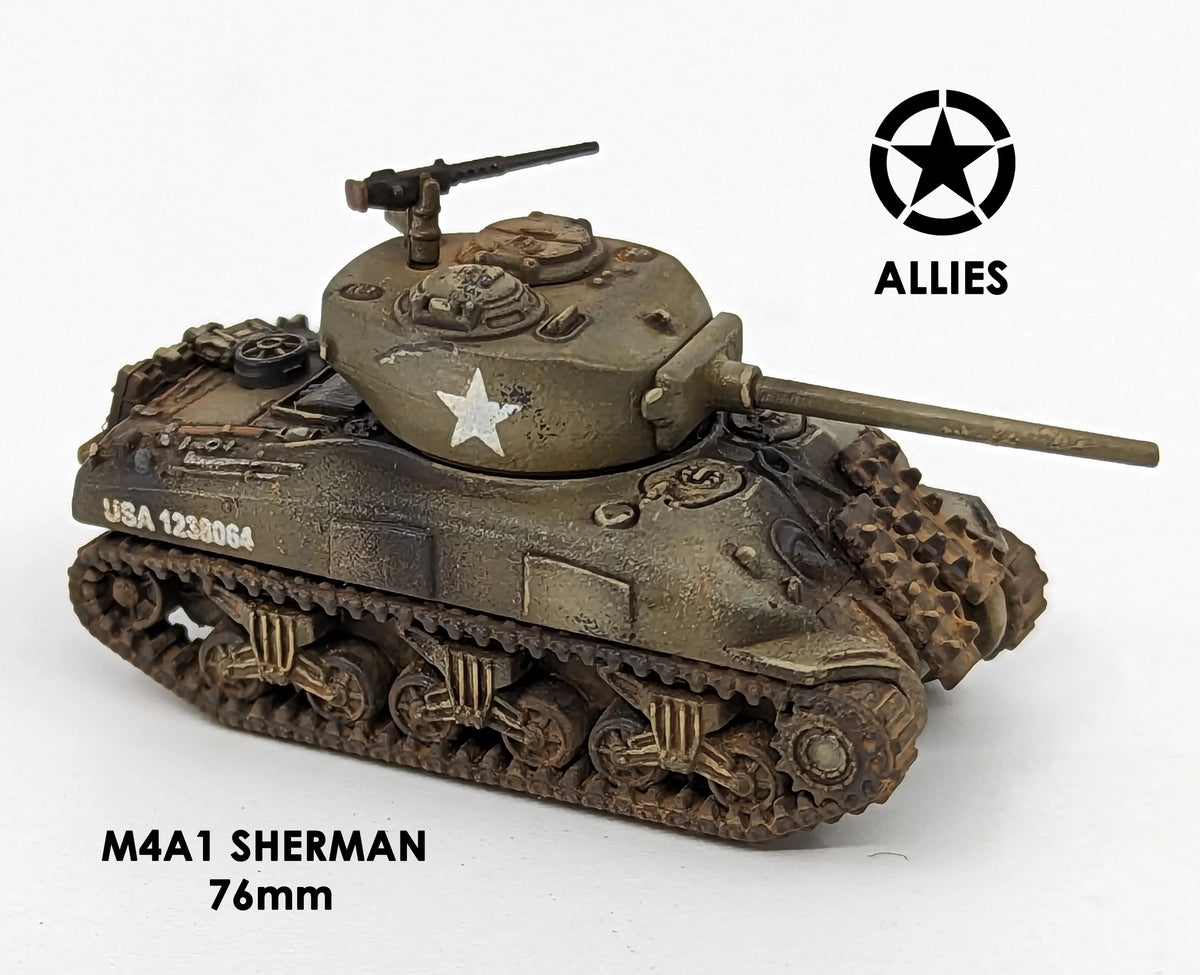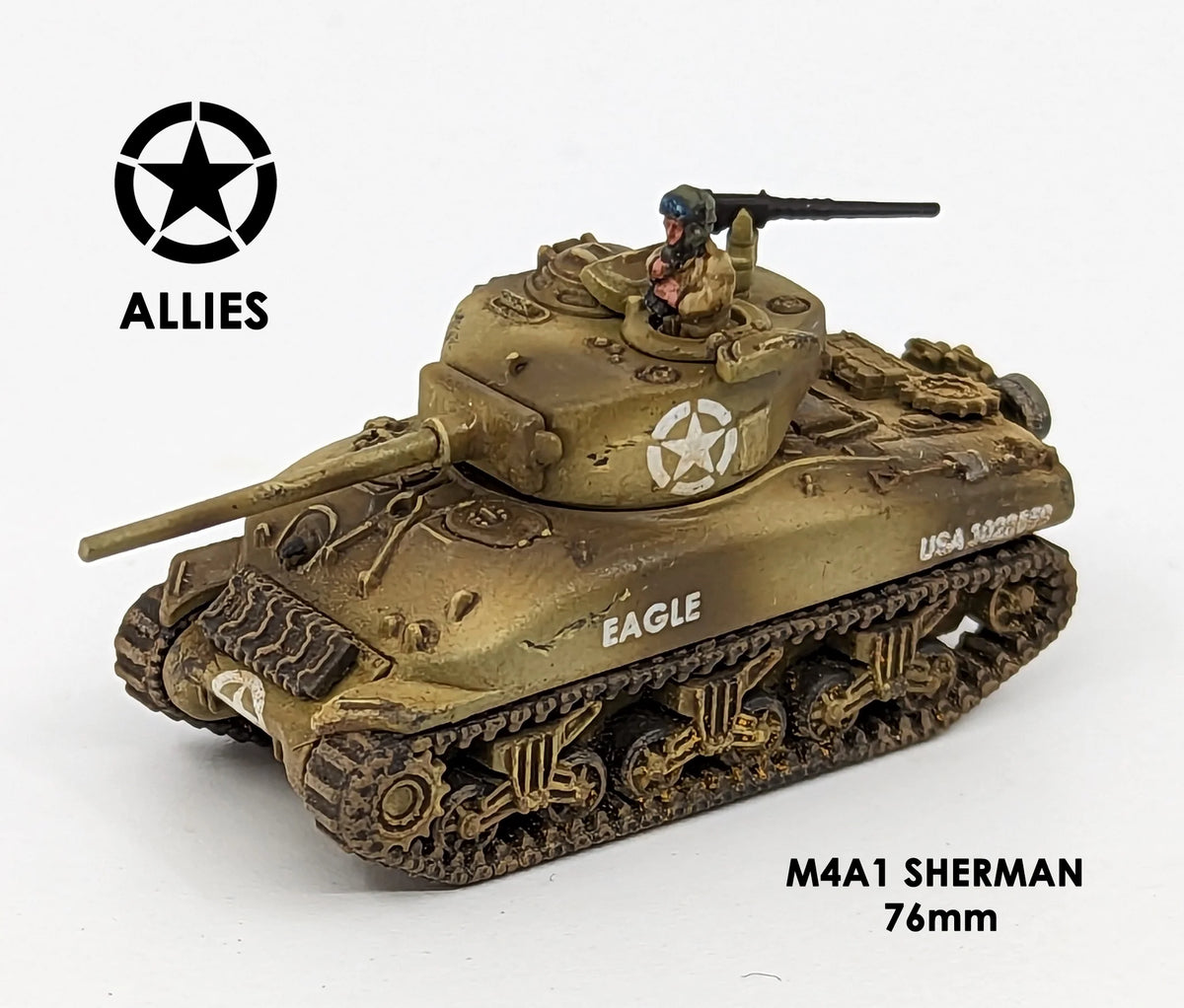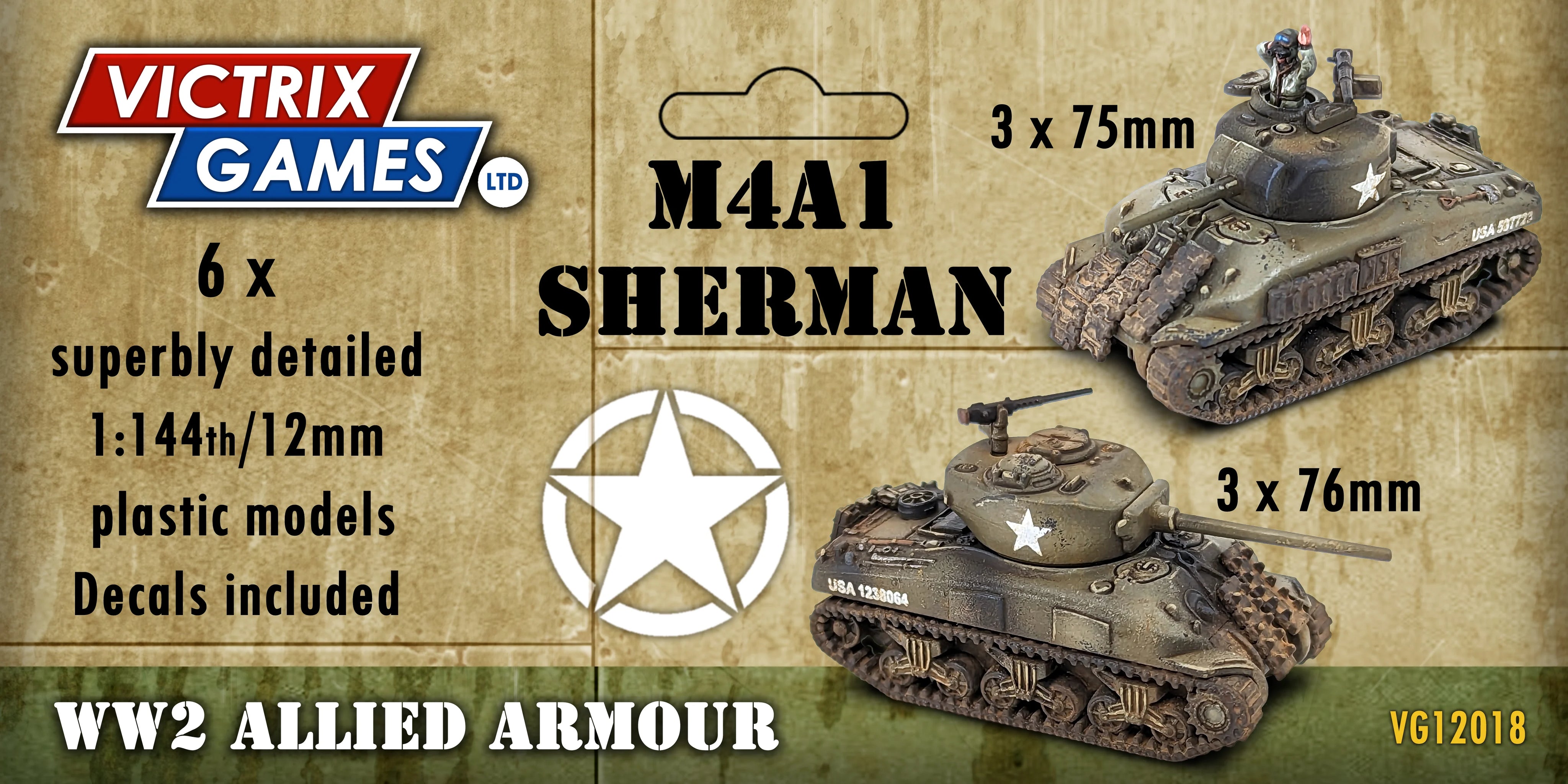 This set includes 6 superbly detailed 12mm/1:144 M4A1 Shermans (early and late versions) and a decal sheet.
