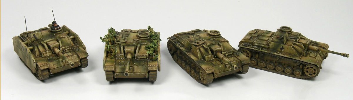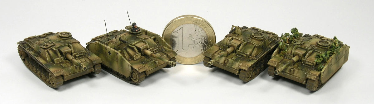 This set includes 6 superbly detailed 12mm/1:144 scale tanks and a decal sheet (German crosses and yellow numbers). The StuG III was a successful assault gun design with a very low silhouette that was armed with a 7.5cm or 10.5cm gun.