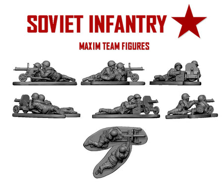 This 174 figure set features many different poses and weapon types. As well as standard infantry armed with rifles and SMGs it also includes a plethora of support weapons such as Maxim MMGs. anti tank rifles, 50mm and 82mm mortars.