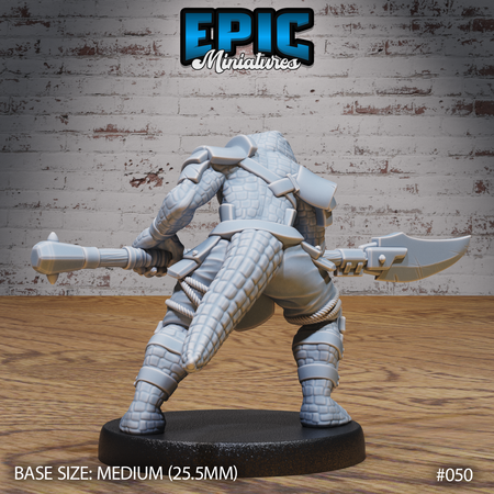 One 3d printed Alligator Folk Spear, with base in 32mm scale. Other scales available including 28mm. Medium Size.