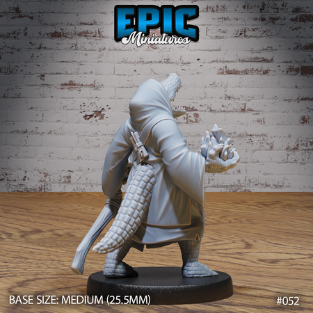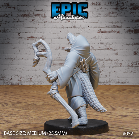 One 3d printed Alligator Folk Wizard, with base in 32mm scale. Other scales available including 28mm. Medium Size.
