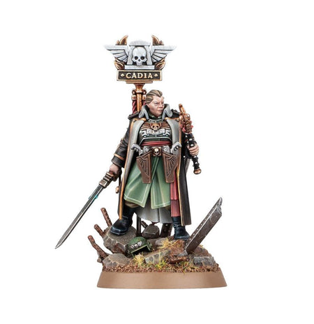 This kit builds Lord Castellan Ursula Creed, an indomitable commandant of the Astra Militarum. Stood atop the rubble of a ruined Imperial world, Ursula strikes an imposing figure with her father's iconic greatcoat slung over her shoulders, an icon of Cadia raised behind her. Twin relic pistols, Duty and Vengeance, are strapped about her waist, and she wields an unsheathed power sword in one hand. In the other, she carries either a pair of magnoculars for surveying the battlefield, or a bejewelled sceptre of her high office. The kit also includes a choice of two heads – one helmeted, and the other bare. Ursula Creed is not only the highest ranking officer of Cadia, but a potent symbol of courage and tenacity, and an ideal centrepiece for any Cadian collection.