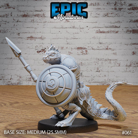 One 3D printed Bandit Lizard Folk with Spear, with base in 32mm scale. Other scales available including 28mm. Medium Size.