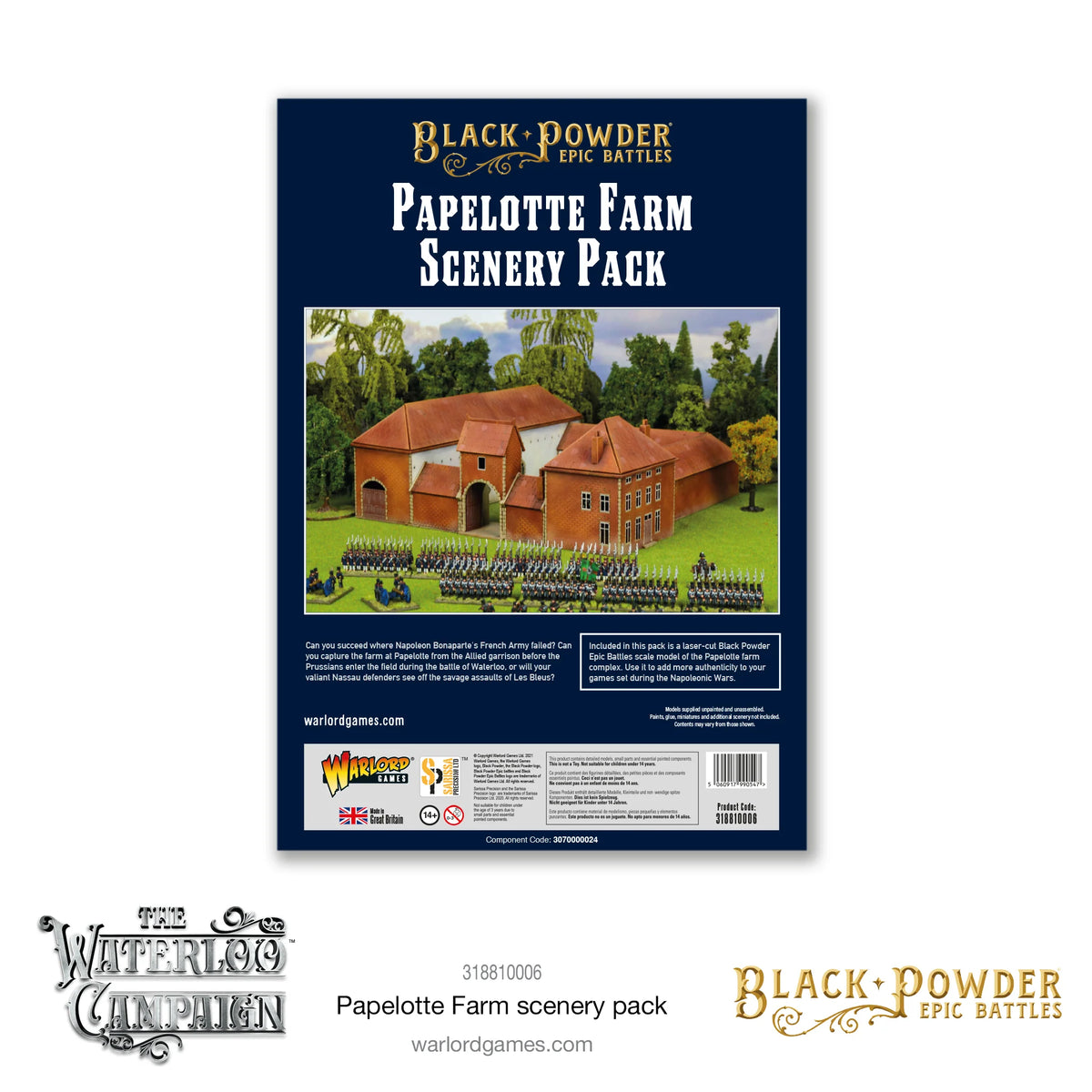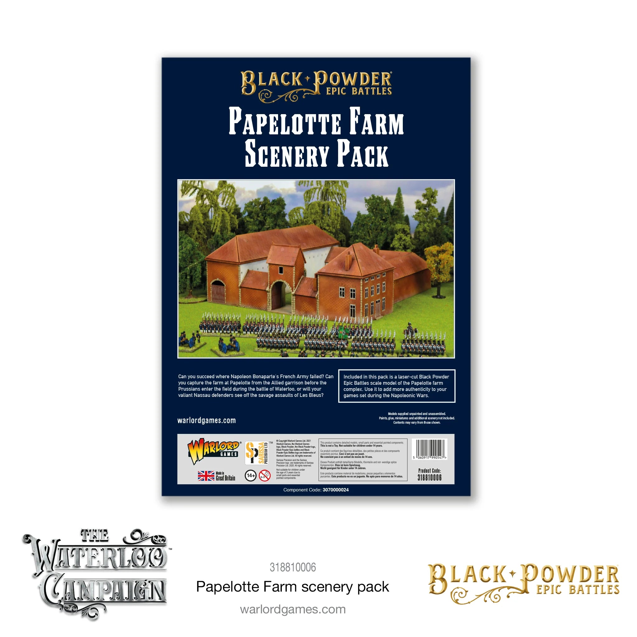 Included in this pack is a laser-cut Black Powder Epic Battles scale model of the Papelotte farm complex. Use it to add more authenticity to your games set during the Napoleonic Wars.