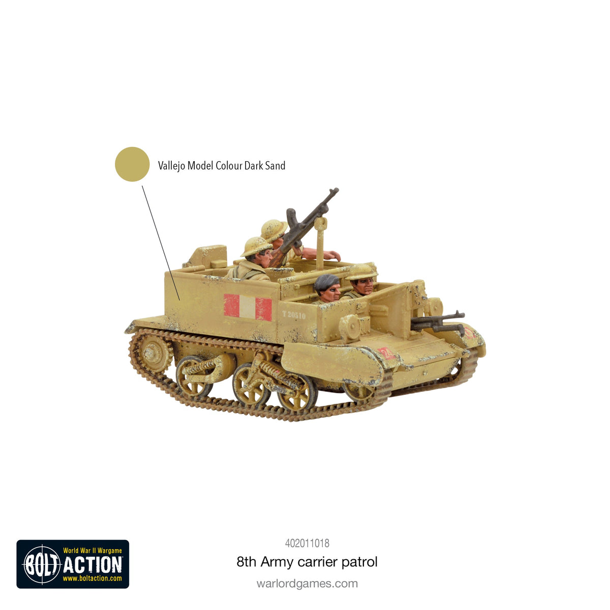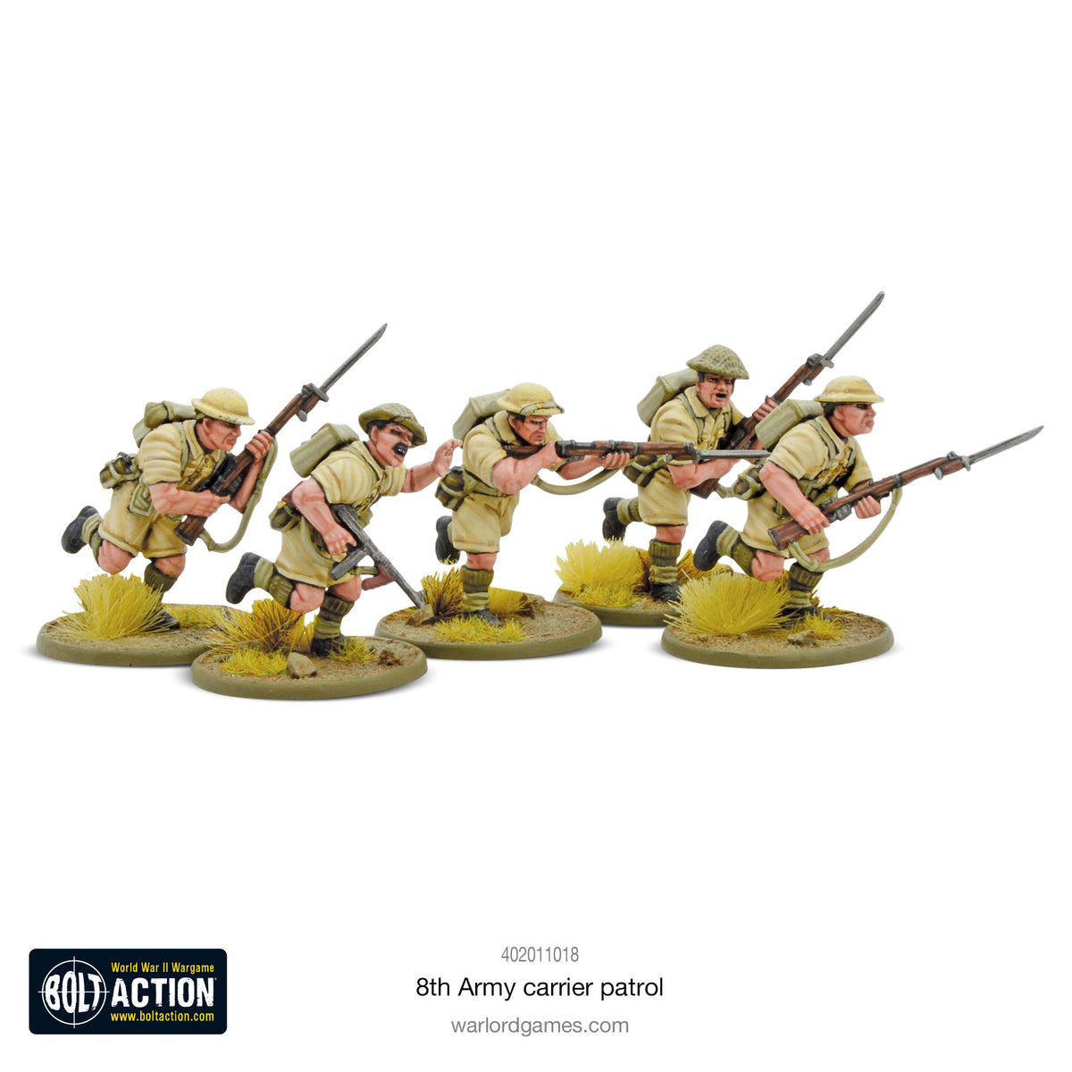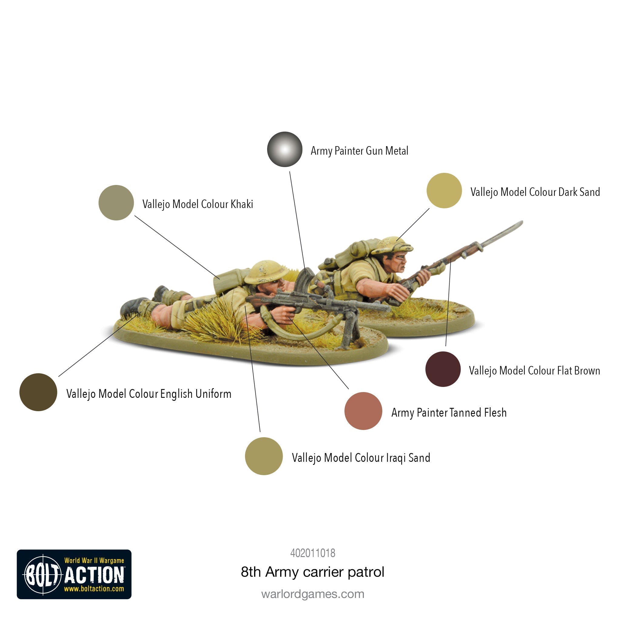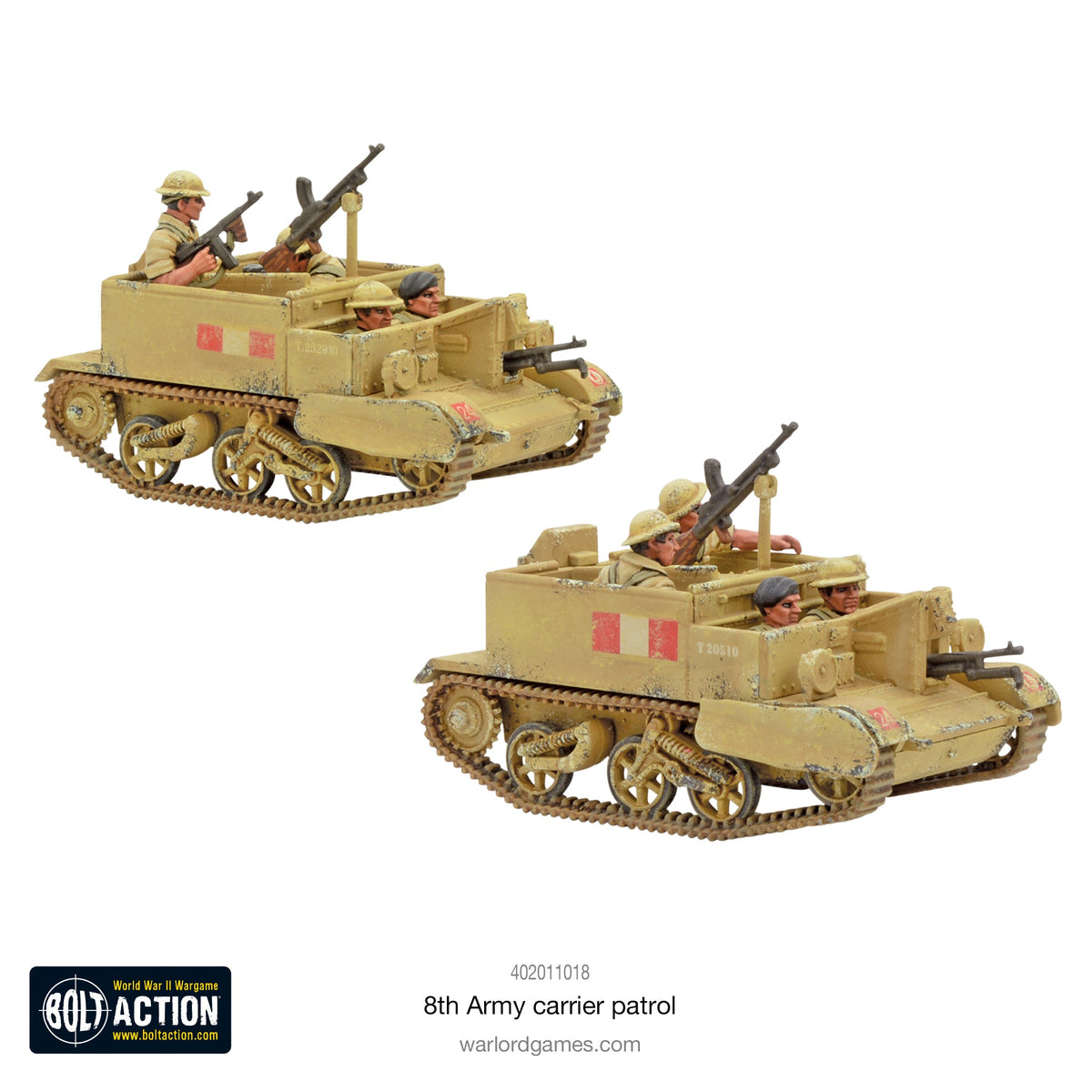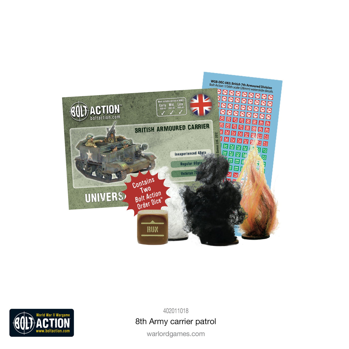 Contains two plastic universal carriers with metal British 8th Army crew, 12 plastic multi-pose 8th Army infantry, Bolt Action stat card, vehicle damage markers and full-colour decal sheet.