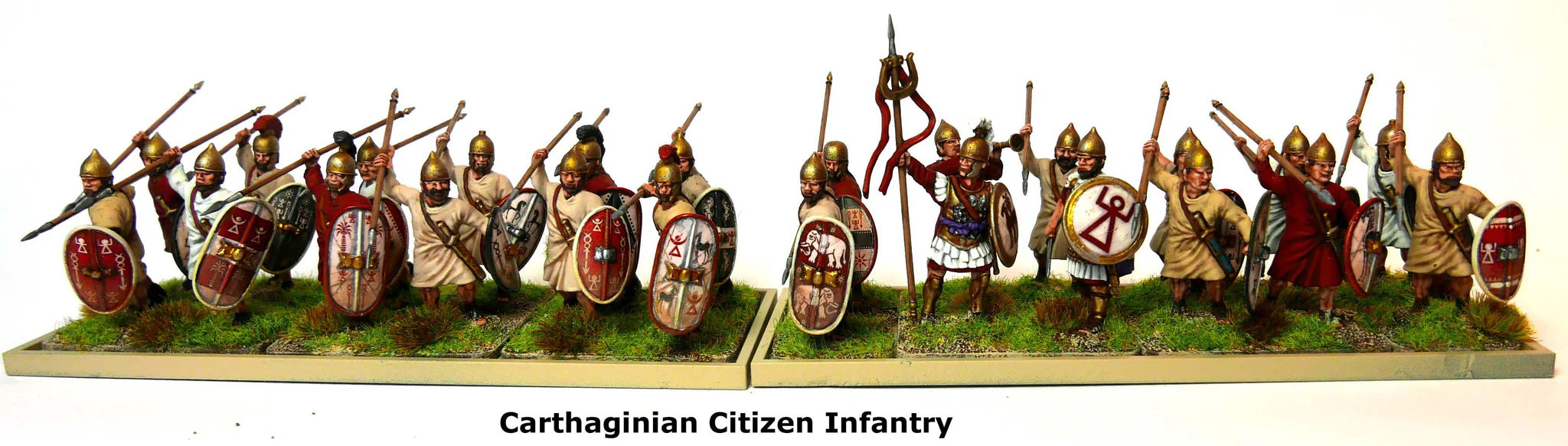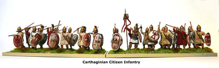 This set represents the Carthaginian Citizen Infantry that were recruited to swell the numbers of the regular Carthaginian military. they were unarmoured but were equipped with helmets shields and spears.