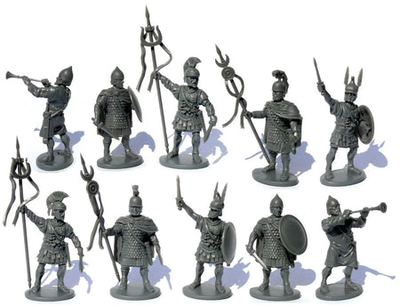 This exceptional 24 figure set of 28mm hard plastic miniatures is superbly detailed and includes a myriad of additional parts, allowing hundreds of options when assembling. This set is fully supported by a range of shield transfers and banner sheets from LBMS.