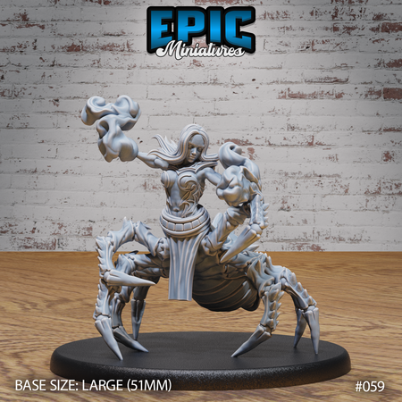 One 3d printed Dark Elf Drider Folk Sorceress, with base in 32mm scale. Other scales available including 28mm. Large Size.