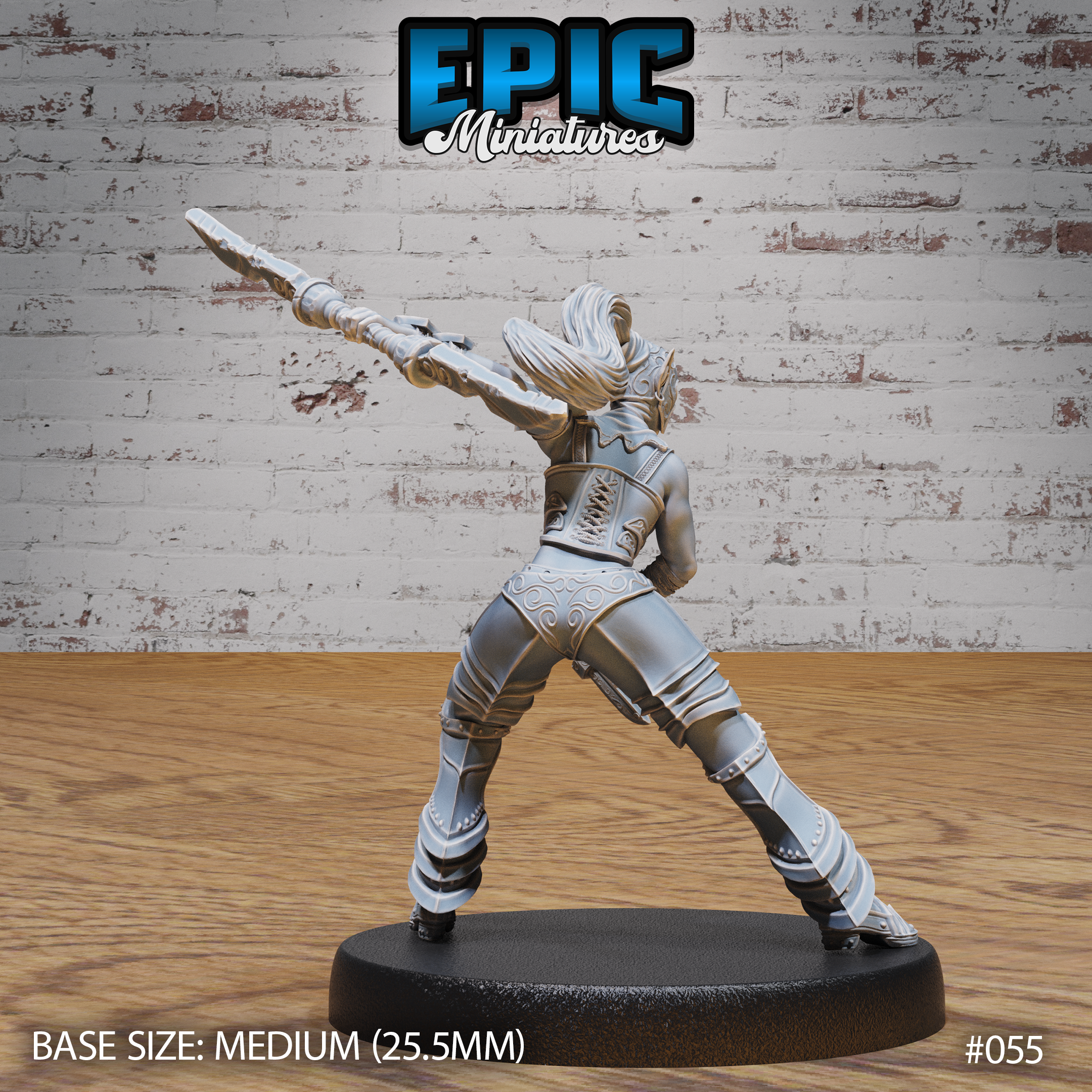One 3d printed Dark Elf Gladiator Female Attacking, with base in 32mm scale. Other scales available including 28mm. Medium Size.