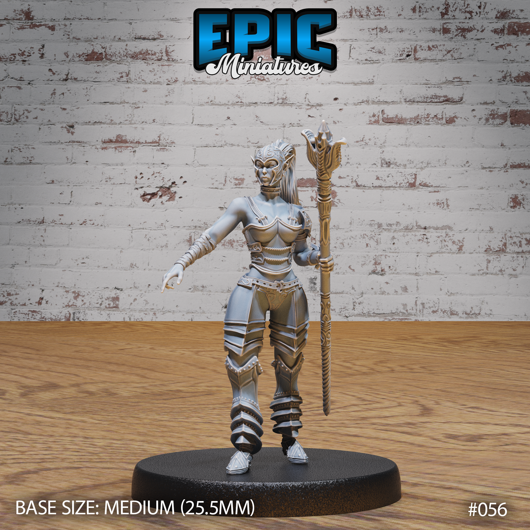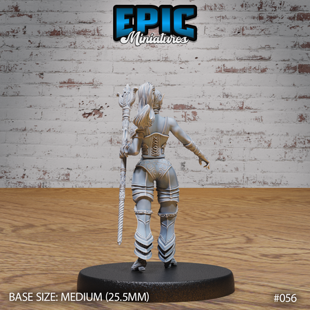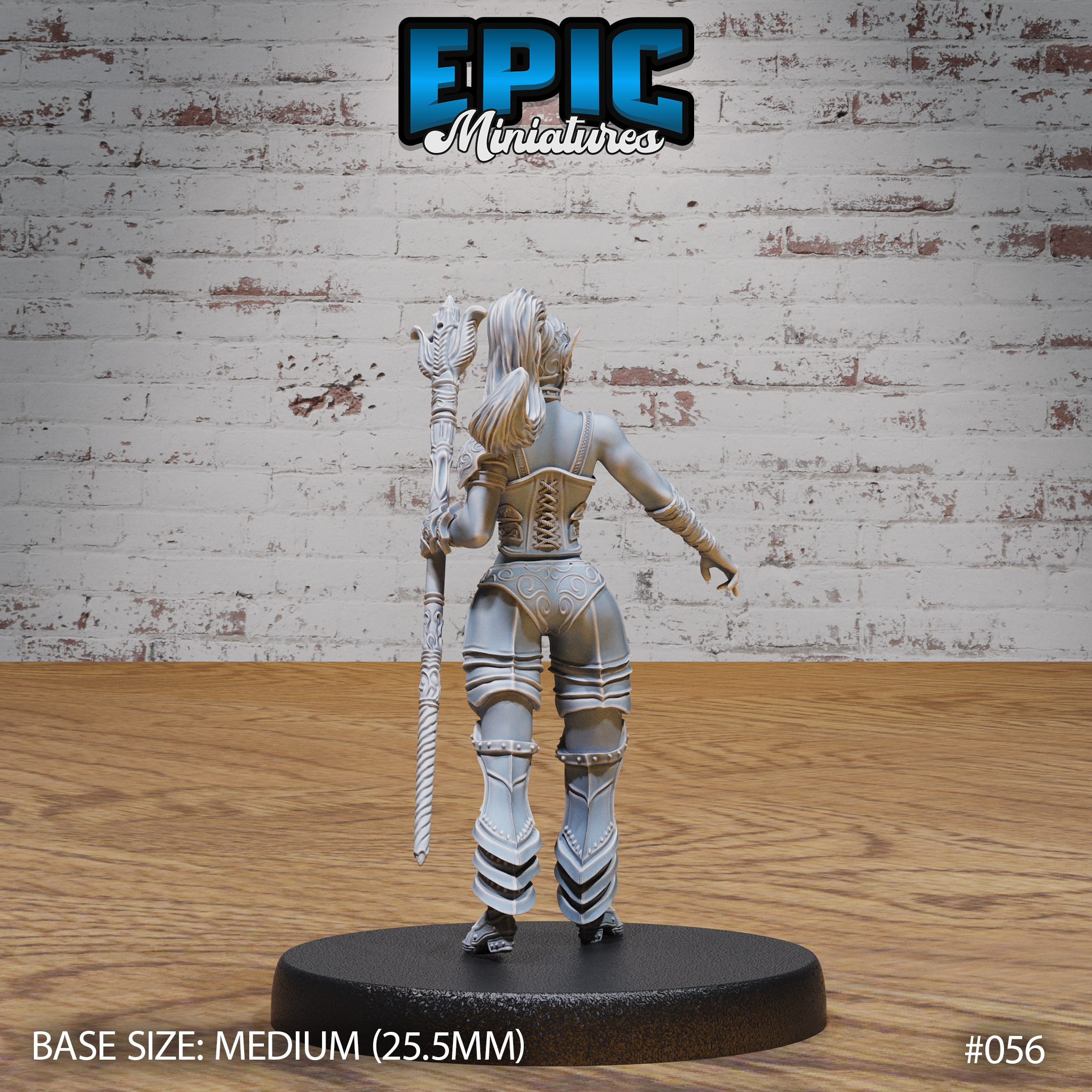 One 3d printed Dark Elf Gladiator Female Staff, with base in 32mm scale. Other scales available including 28mm. Medium Size.