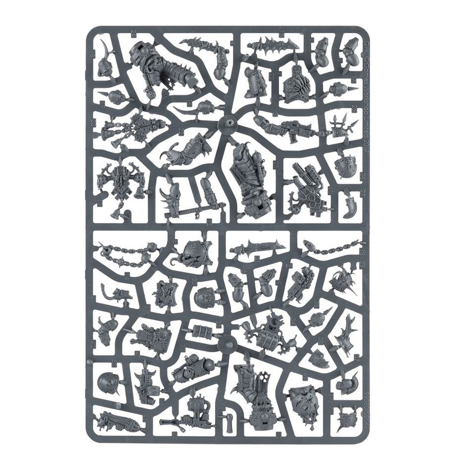 This multi-part plastic kit contains the components necessary to assemble a 7-man squad of Plague Marines. Each is posed dynamically, with the usual Death Guard accoutrements – cracked, rotting armour revealing grasping tentacles, severed heads displayed proudly on belts, backpacks sloshing with unnatural diseases and pipework leading from rebreathers to Nurgle knows what foul concoctions. There’s an Icon of Despair included, so your unit can feature an icon bearer.