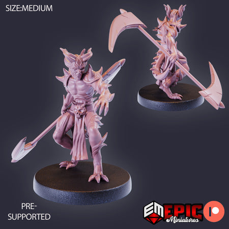 One 3D printed Devil Army Dual Scythe with base in 32mm scale. Other scales available including 28mm. Medium Size.