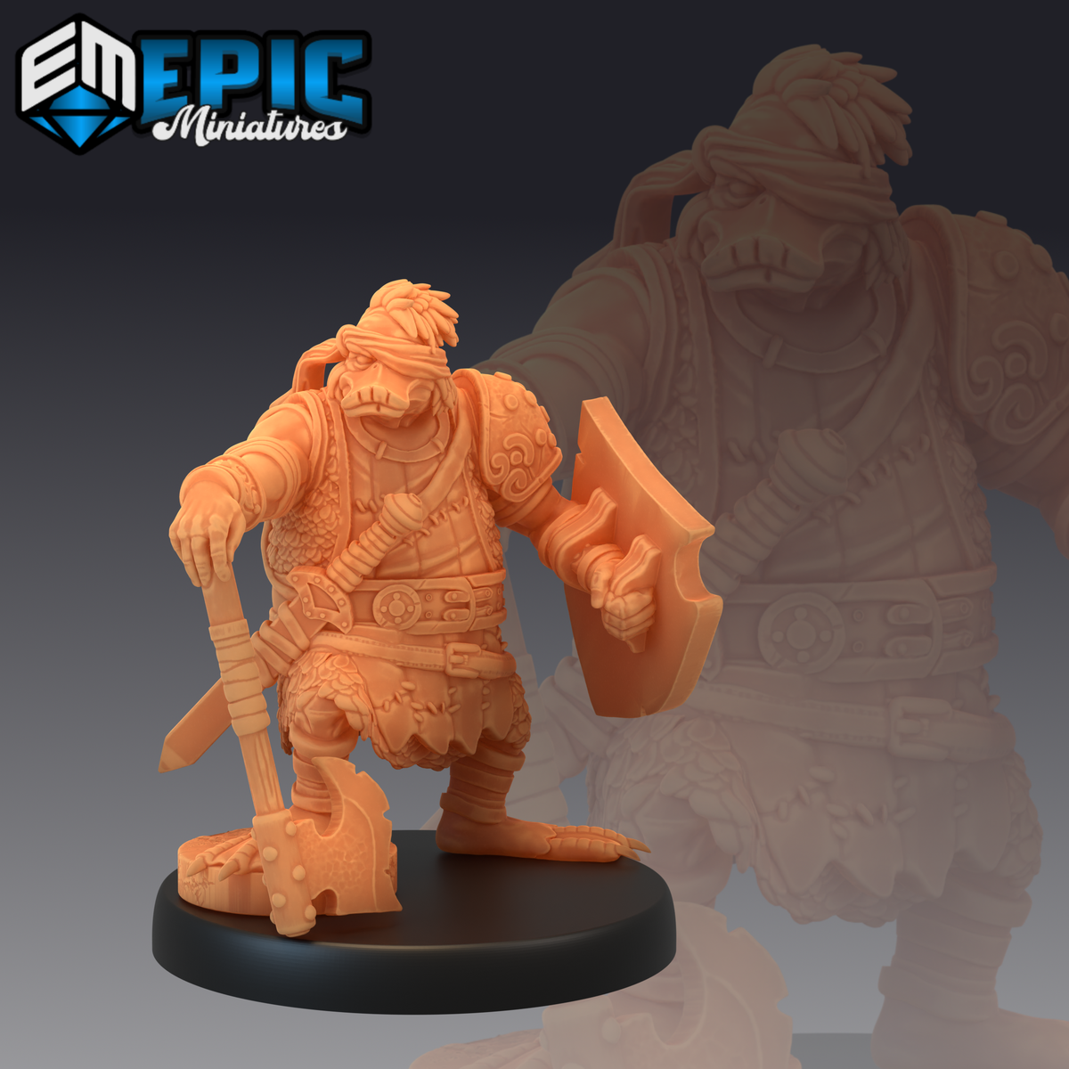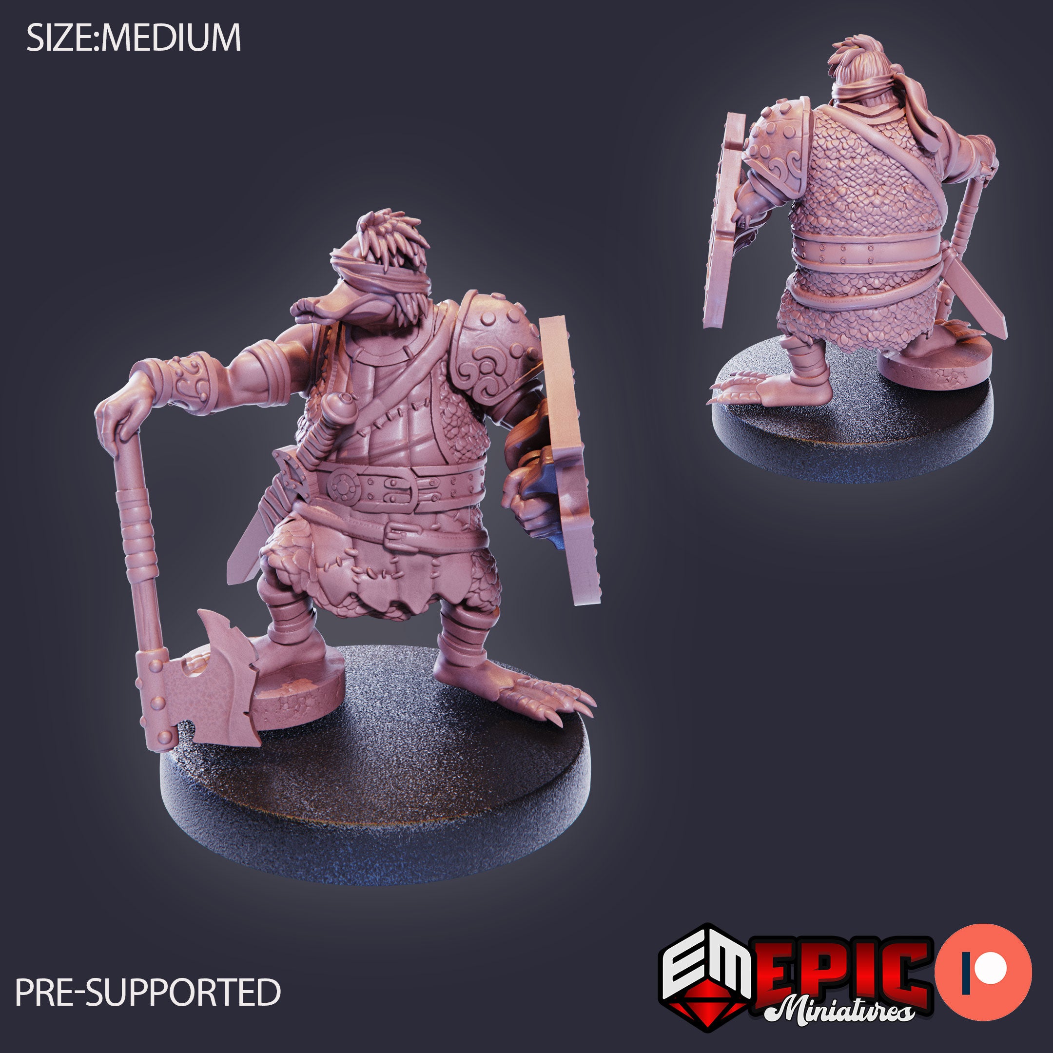 One 3D printed Duck Folk Mercenary Axe & Shield with base in 32mm scale. Other scales available including 28mm. Medium Size.