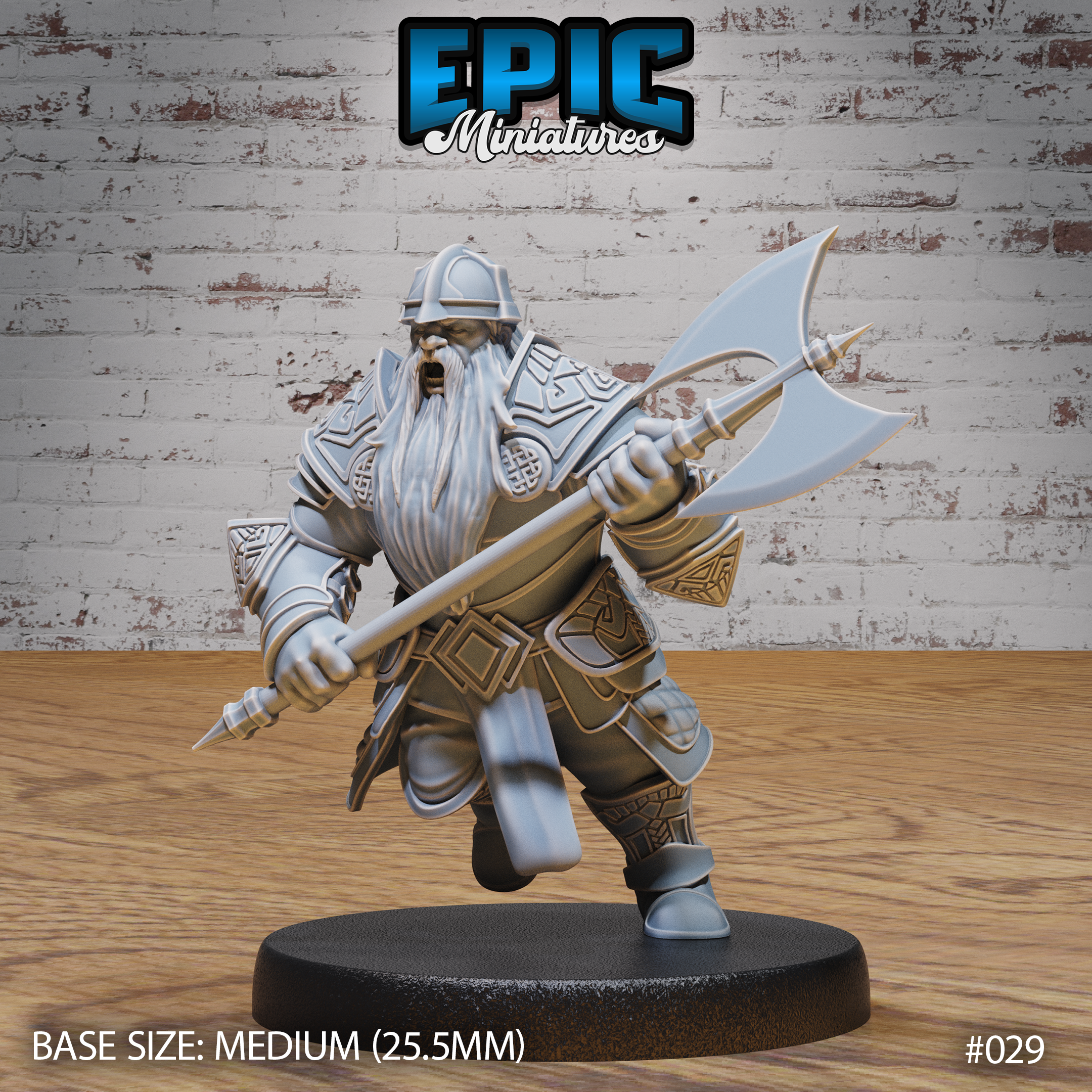 One 3D printed Dwarf Army Battle Axe, with base in 32mm scale. Other scales available including 28mm. Medium Size.