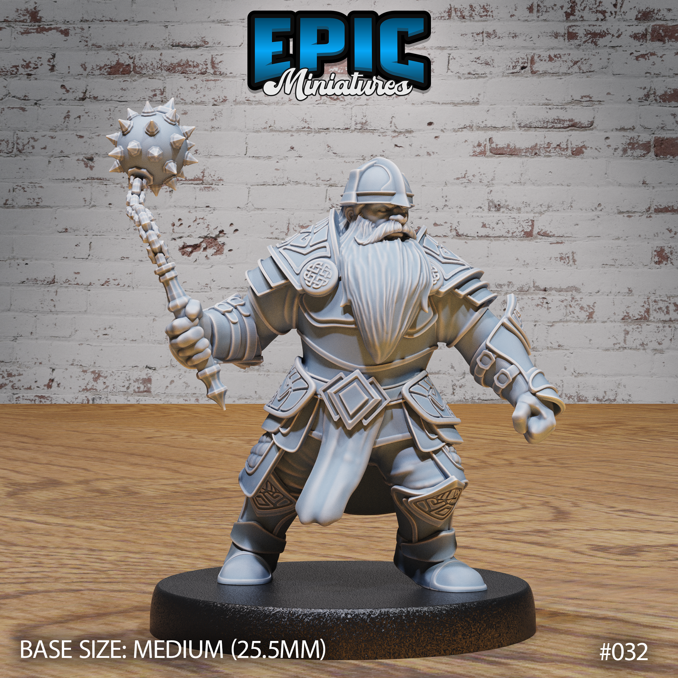 One 3D printed Dwarf Army Morningstar, with base in 32mm scale. Other scales available including 28mm. Medium Size.