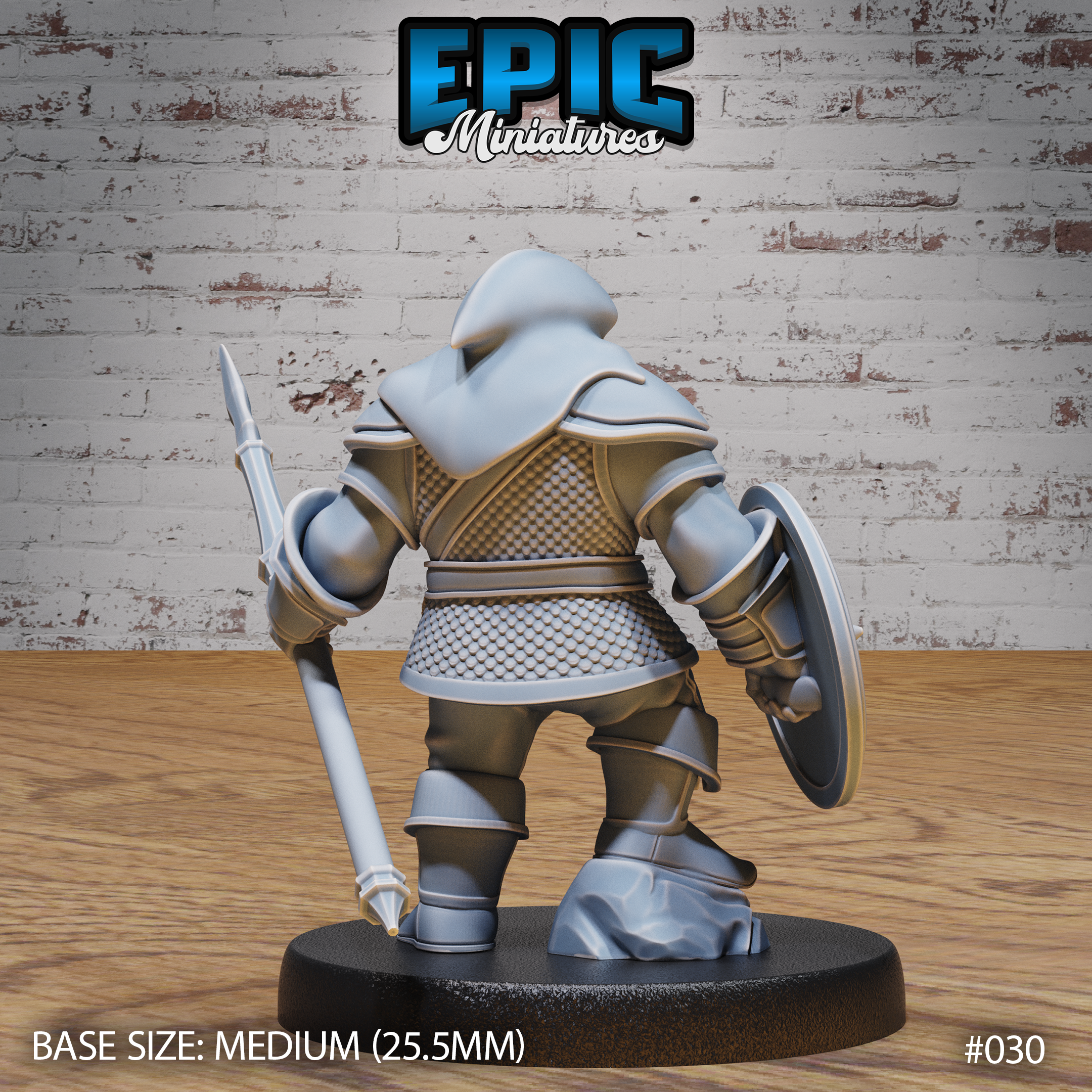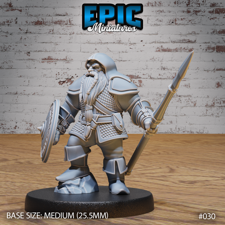 One 3D printed Dwarf Army Spear & Shield, with base in 32mm scale. Other scales available including 28mm. Medium Size.