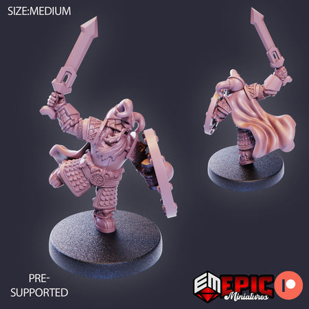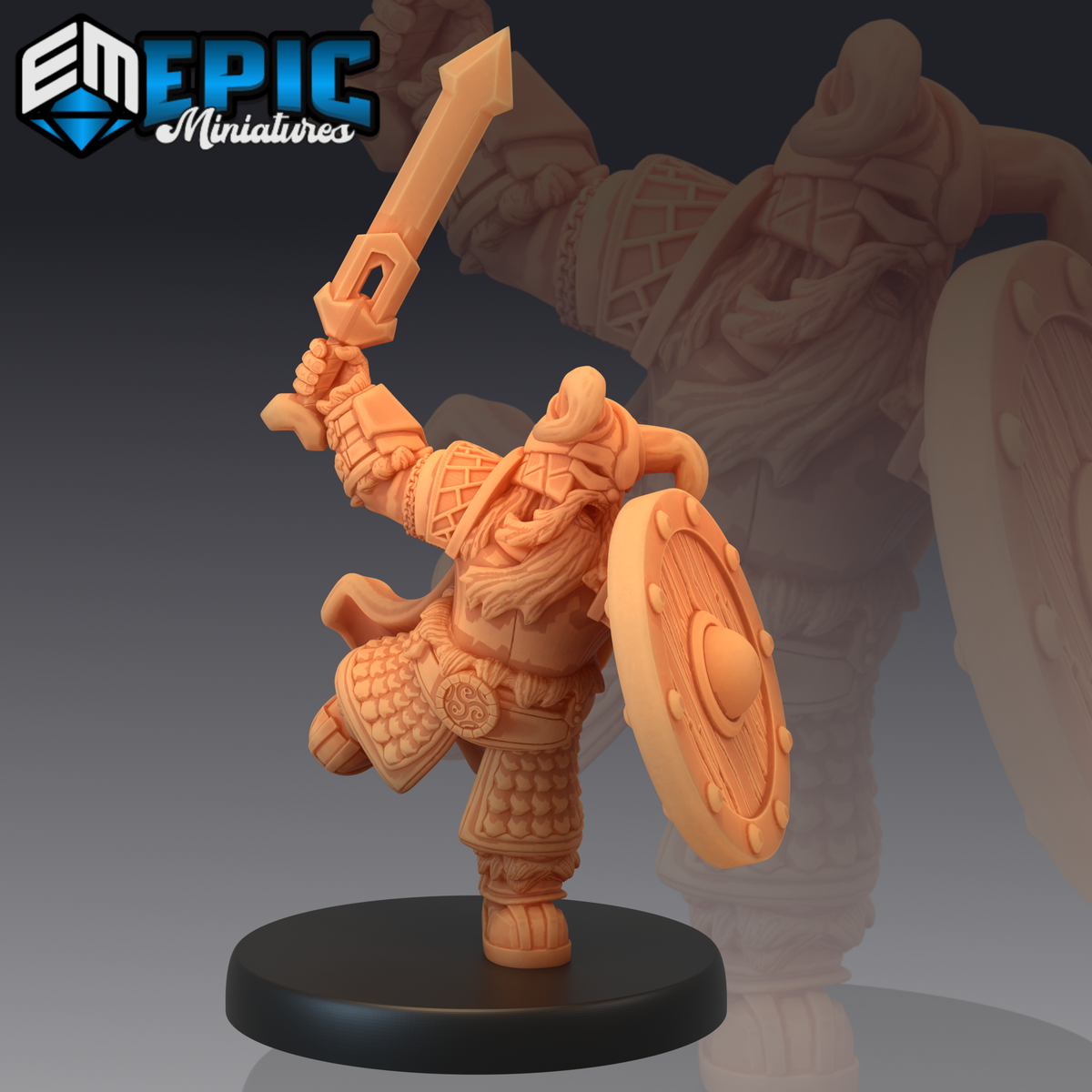 One 3D printed Dwarf Army Sword & Shield with base in 32mm scale. Other scales available including 28mm. Medium Size.
