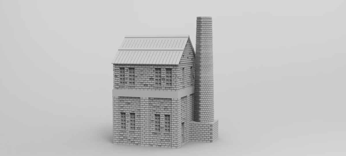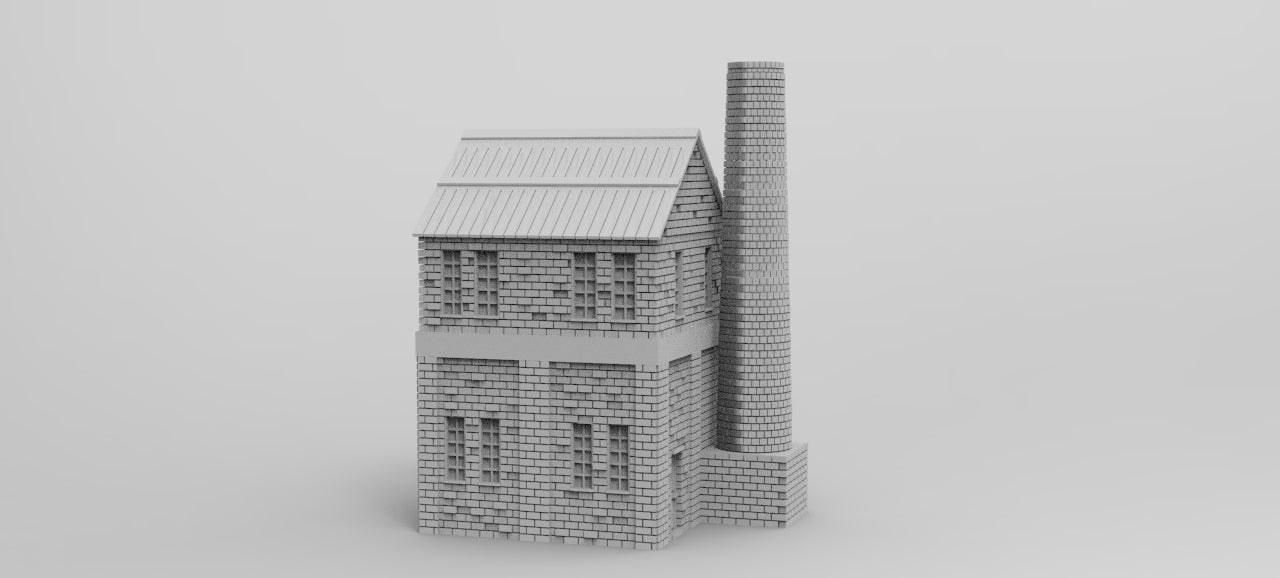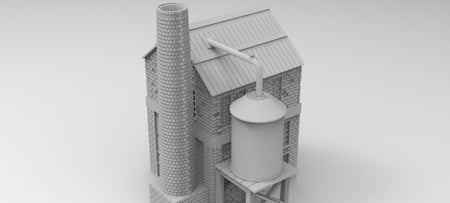 Factory building terrain piece with chimney and water tower. Scale is 1/56. Ask about other scales.