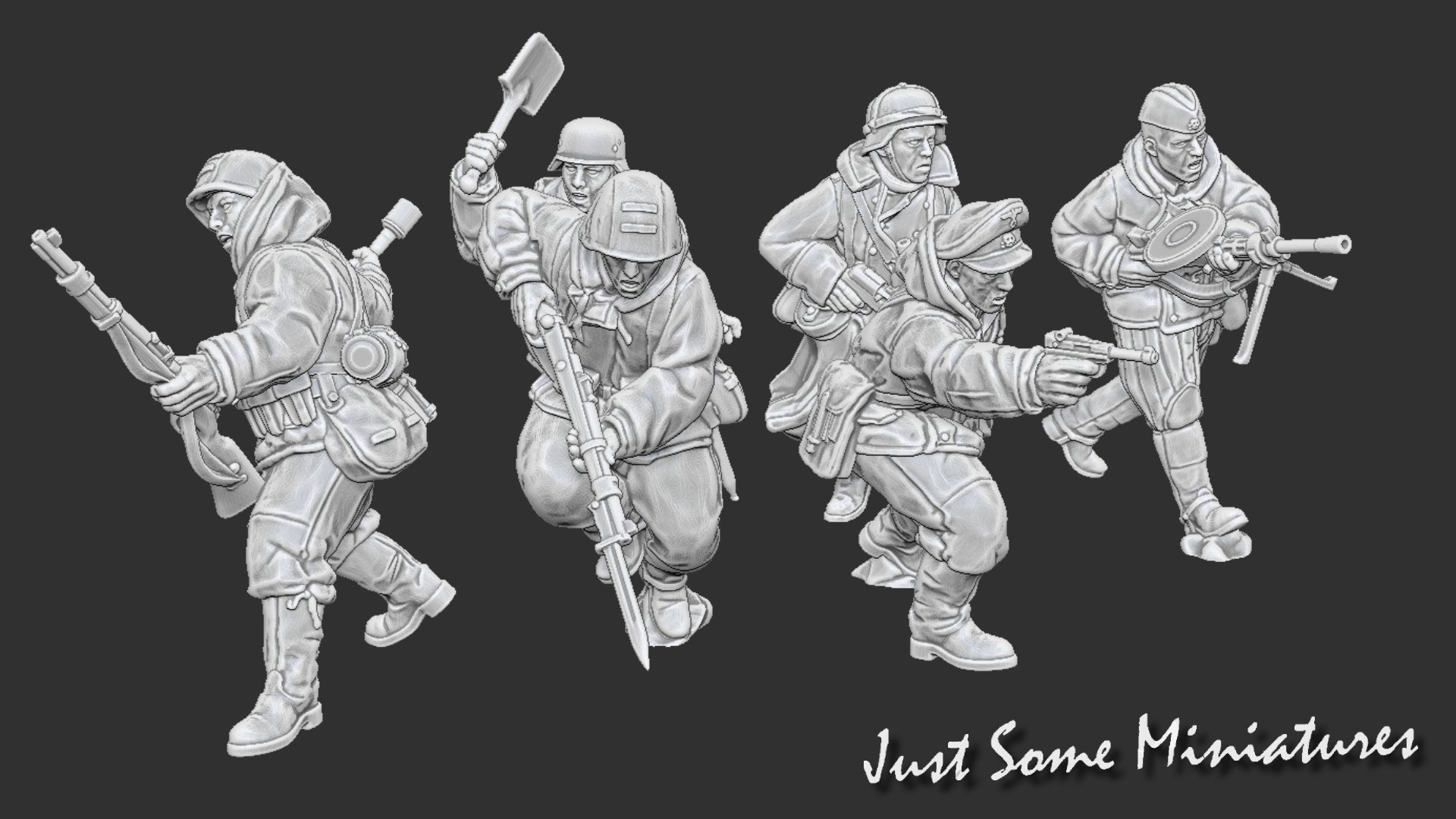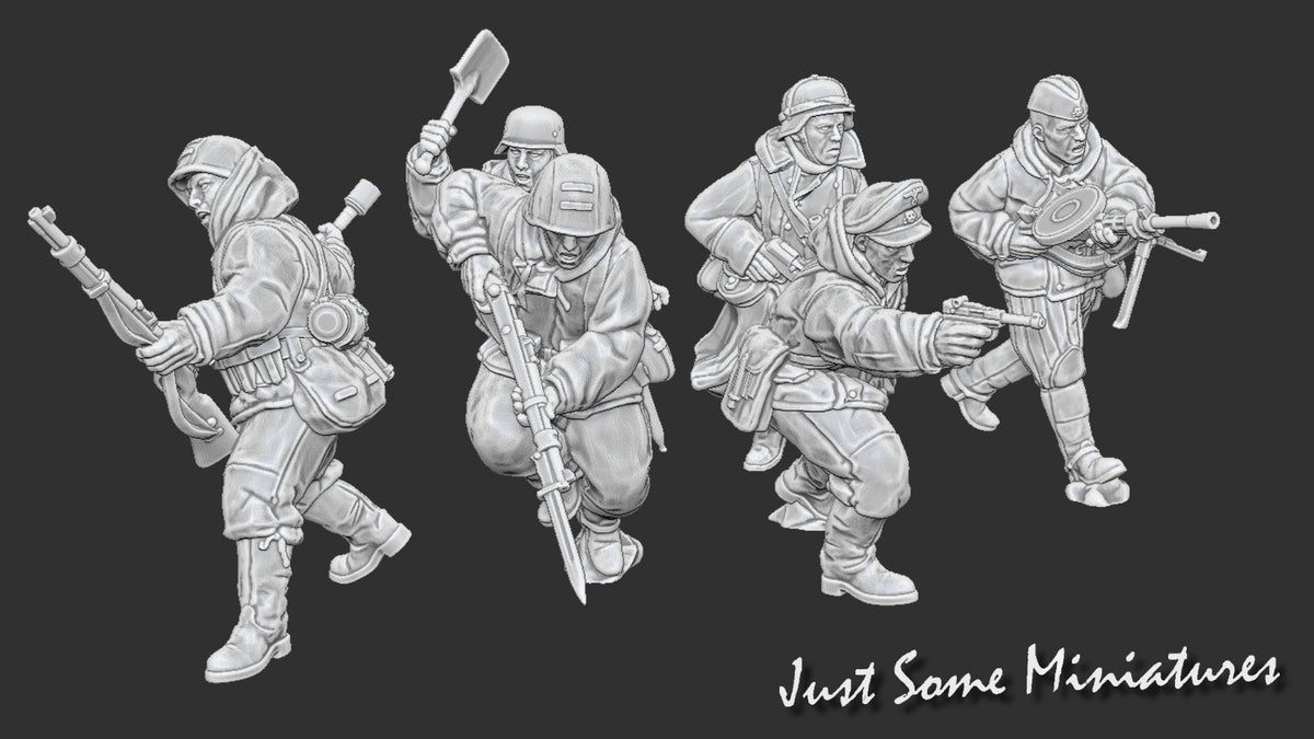 Six 3D Printed German Late War Cavalry soldiers armed with a variety of Soviet weapons. Includes six miniatures and bases. Scale 1/56. - 28mm. Other scales available