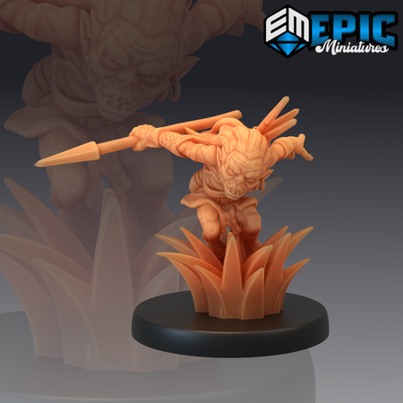 One 3D printed Goblin Scout with base in 32mm scale. Other scales available including 28mm. Medium Size.
