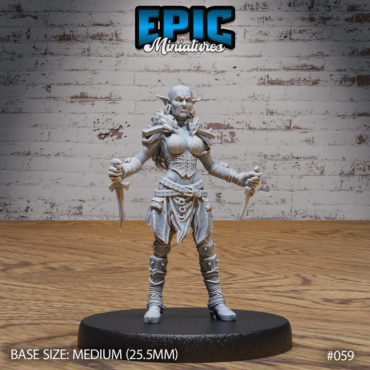 One 3d printed Hobgoblin Adventurer Female Daggers, with base in 32mm scale. Other scales available including 28mm. Medium size.