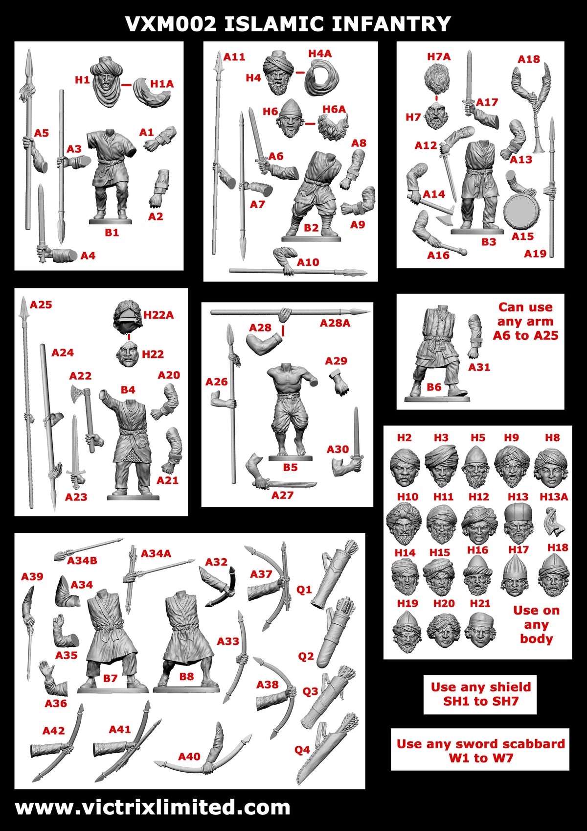 These represent Islamic infantry of the Middle East and Spain from the 7th Century onwards into the Crusader era of the 12th and 13th centuries.