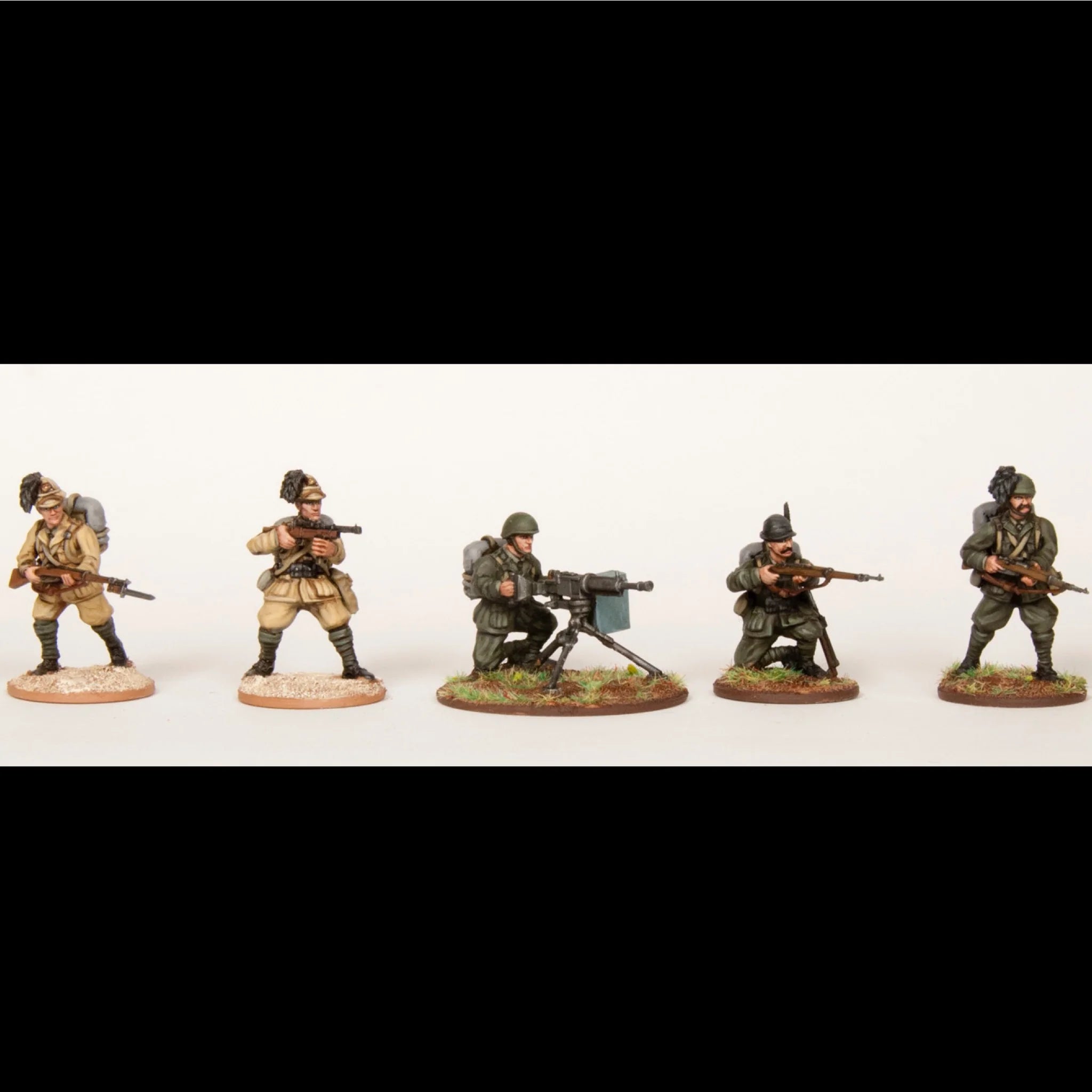This hard plastic box set allows you to build up to 32 soldiers equipped with standard Carcano rifles and carbines, Beretta Model 38s, Breda 30s, grenades, pistols, and more. You can also build up to two Breda 37 heavy machine guns with crew. Several different heads are included for all figures including the standard helmet, pith helmet, Alpine hat, Bustina, and separate feathers to create Bersaglieri!