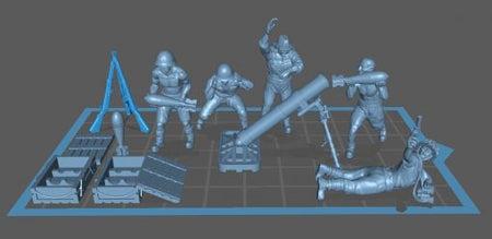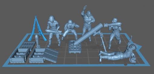 The set contains the mortar, the crew, a spotter and some crates and ammo shells in 28mm scale.