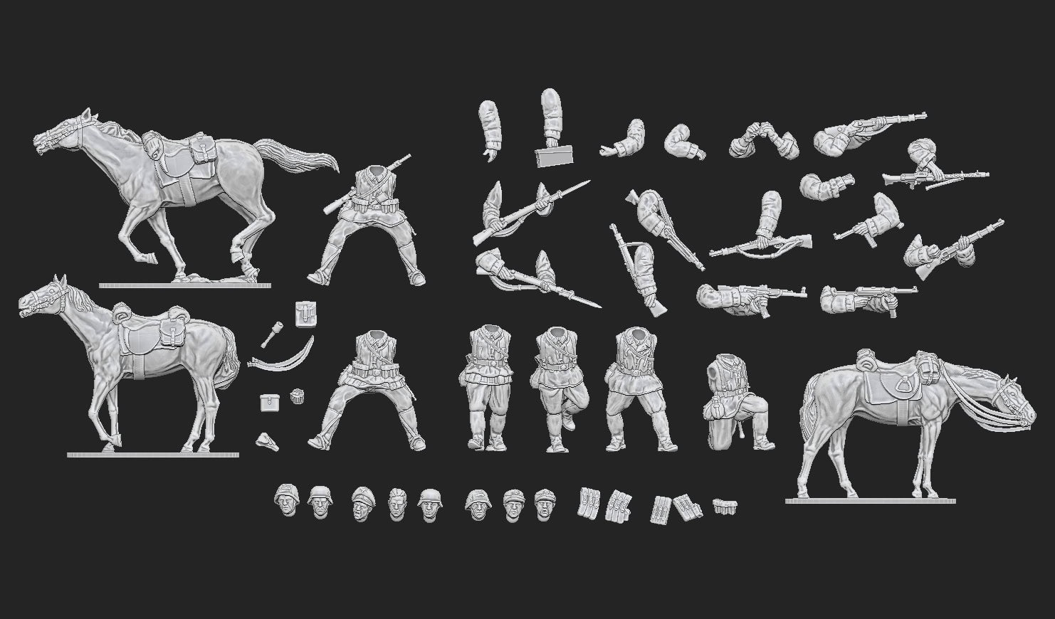 3D Printed Late War '44 German Cavalry Kitbash Kit. Includes the mini parts indicated in the photo (one extra rider included but not shown). Scale 1/56. - 28mm
