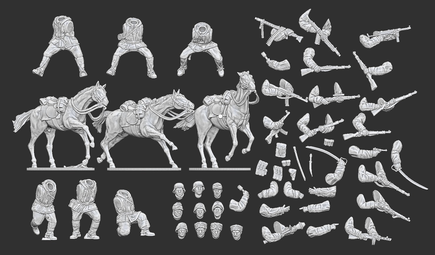 3D Printed Late War German Cavalry Multi-Part Kit. Includes the mini parts indicated in the photo. Scale 1/56. - 28mm