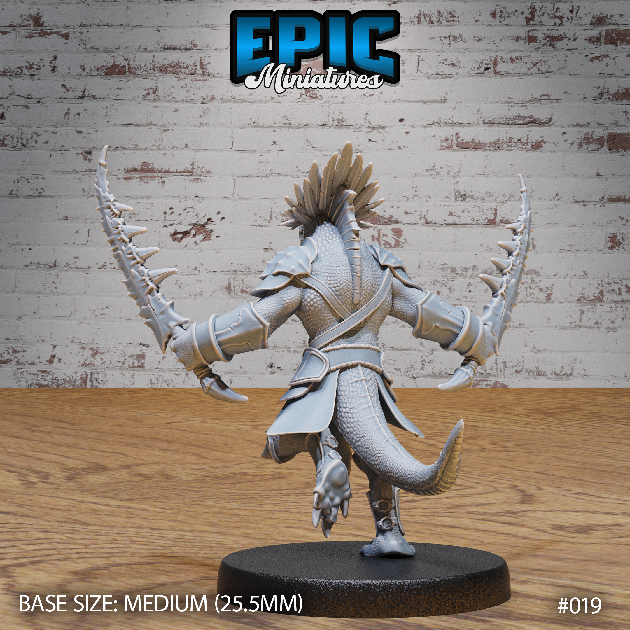 One 3D printed Lizard Folk Army Dual Swords, with base in 32mm scale. Other scales available including 28mm. Medium Size.