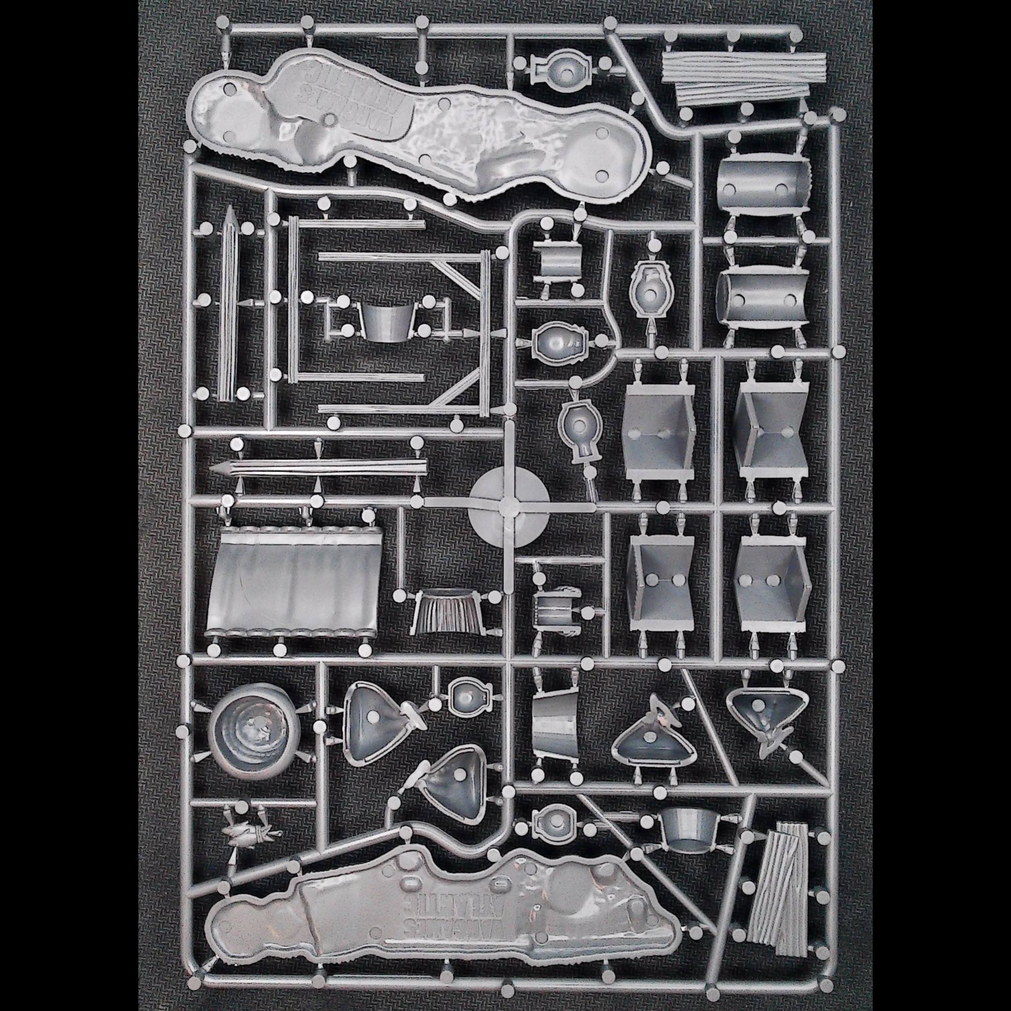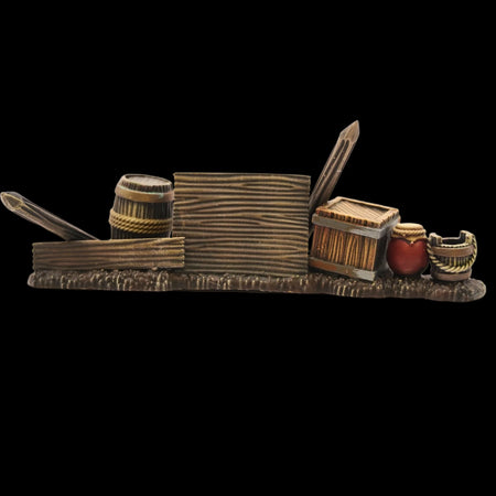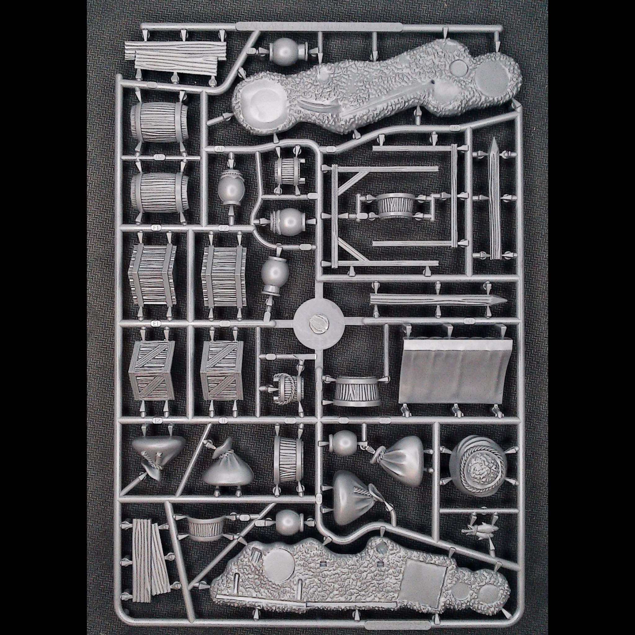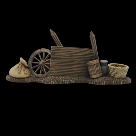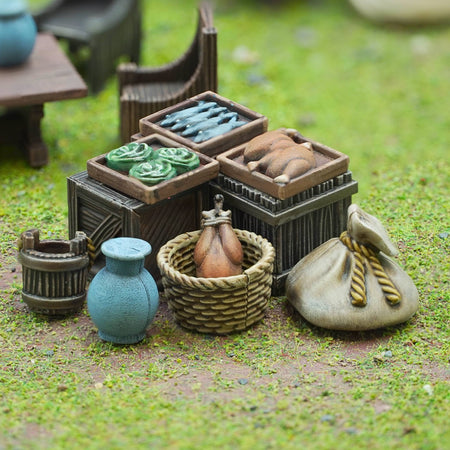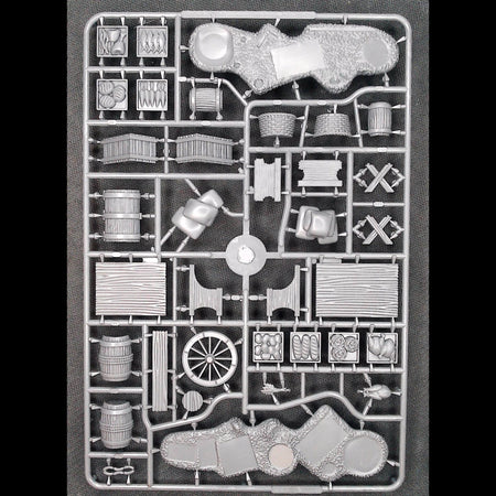 This clever (if we do say so ourselves!) hard plastic set features two unique frames that can be assembled to create 8 barricades. OR the same components (minus the barricade bases) can be built as a full marketplace including covered stalls, trestle tables, chairs, chests, buckets, baskets, barrels, sacks, pots, crates, and a variety of food stuffs!