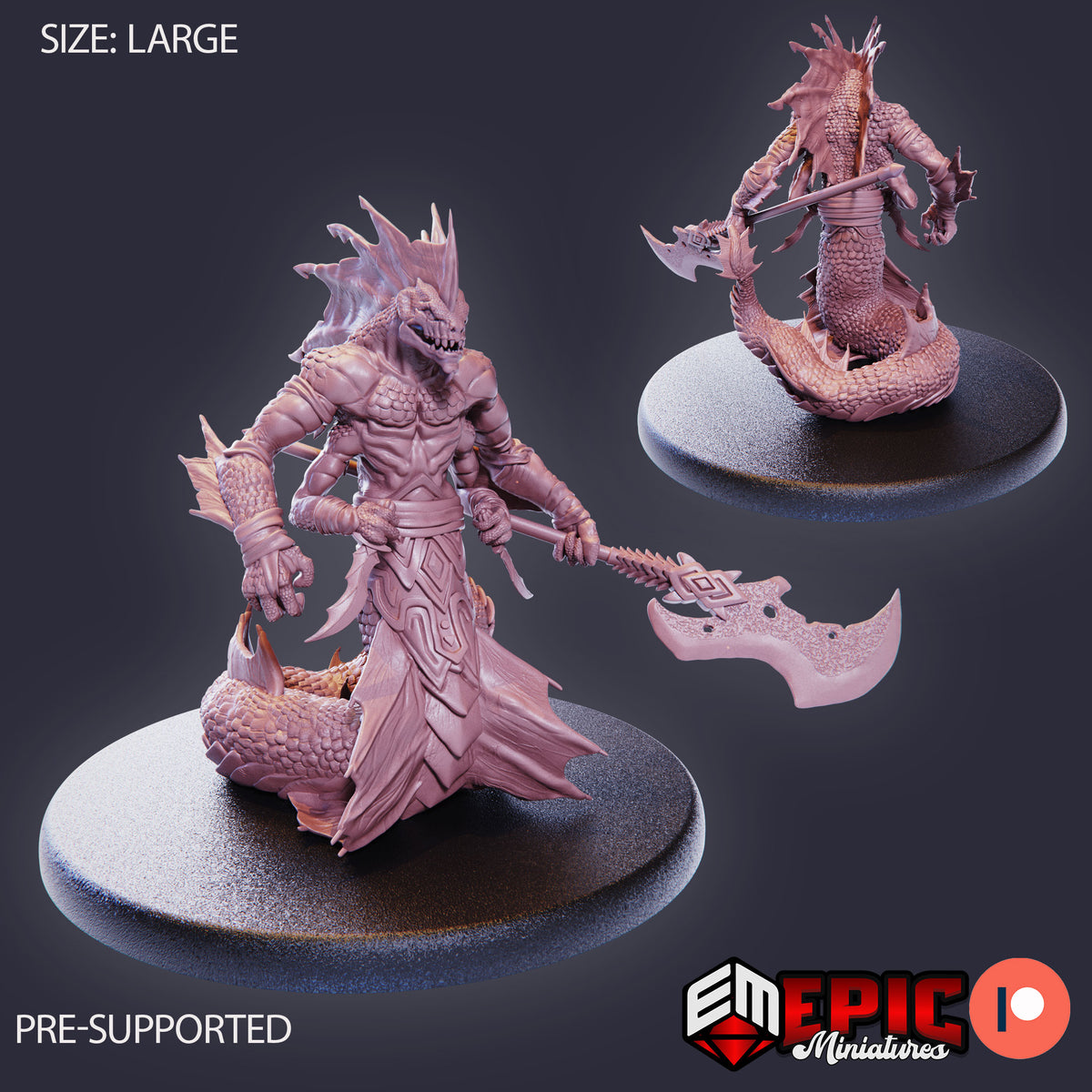 One 3D printed Marsh Naga Warrior with base in 32mm scale. Other scales available including 28mm. Large Size.