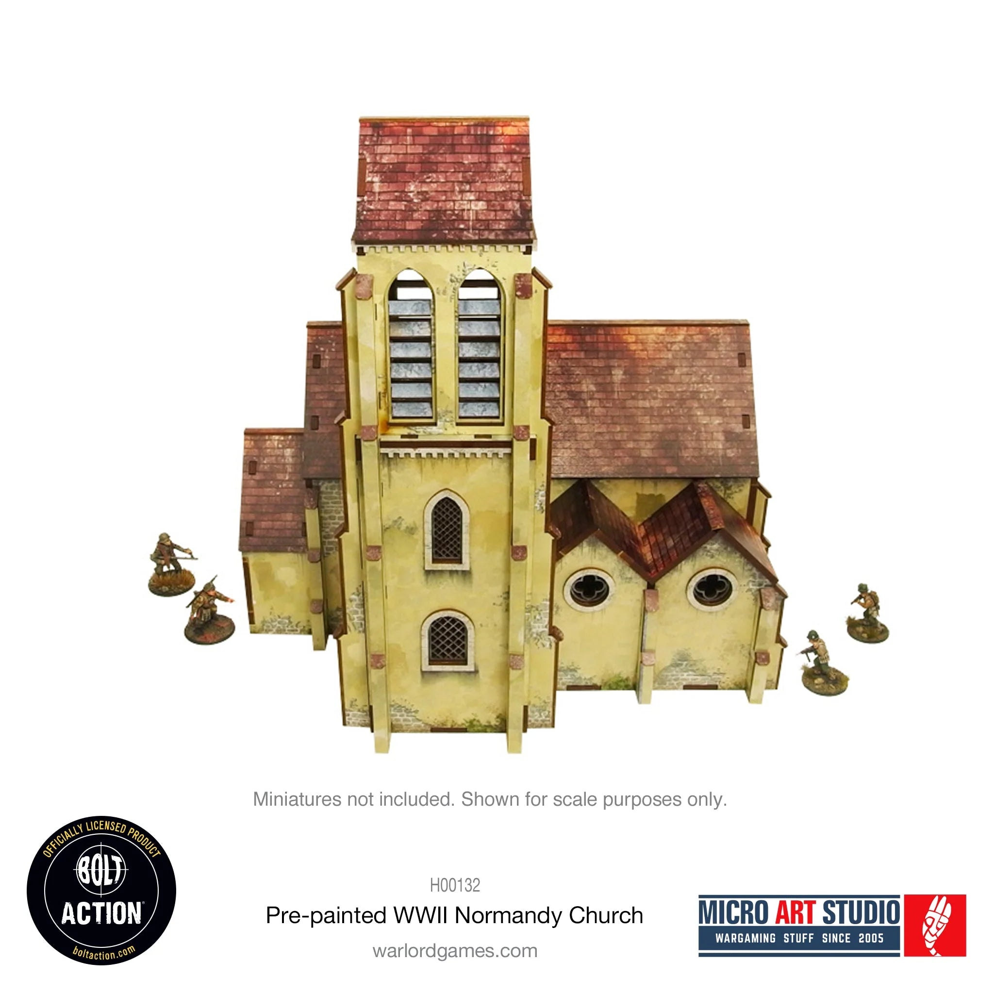 Multicolor prepainted (UV-printed) WW2 Normandy Church building with accessible colorful interior and removable roofs. The bell tower is a separate piece and is the iconic spotter or sniper spot. Pre-cut acrylic transparent window panels included. Option to assemble with open or closed doors.