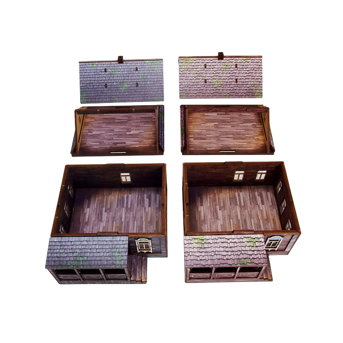 Multicolour pre-painted (UV-printed) WW2 Ostfront (East Front) Village Doma (Houses) - two (2) buildings with accessible colourful interiors and removable roofs. Room to fit a whole infantry squad inside. Pre-cut acrylic transparent windowpanes included. Option to assemble with open or closed doors.