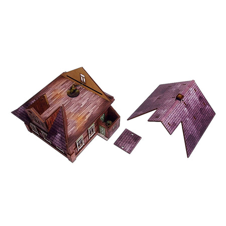 Multicolour pre-painted (UV-printed) WW2 Ostfront (East Front) Village Dacha (House) - a building with an accessible colourful interior and removable roof. It is large to fit a whole infantry squad inside. Pre-cut acrylic transparent windowpanes included. Option to assemble with open or closed doors.