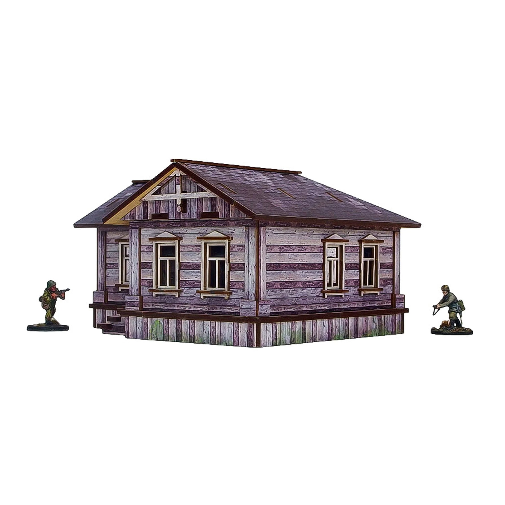 Multicolour pre-painted (UV-printed) WW2 Ostfront (East Front) Village Dom (House) - a building with an accessible colourful interior and removable roof. It is large enough to fit a whole infantry squad inside. Pre-cut acrylic transparent windowpanes included. Option to assemble with open or closed doors.
