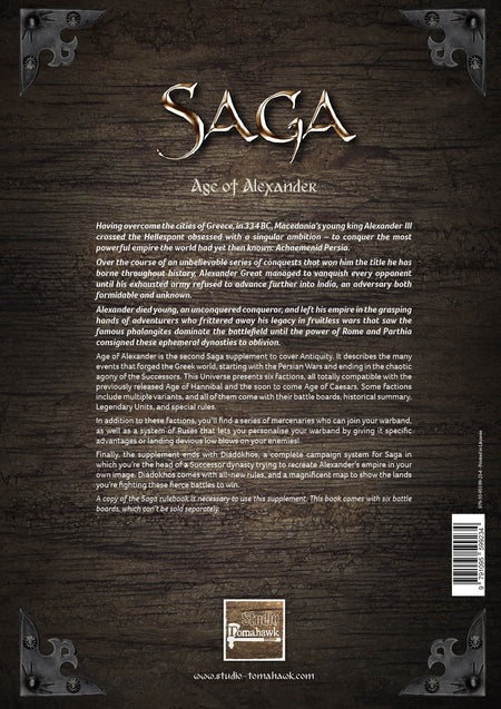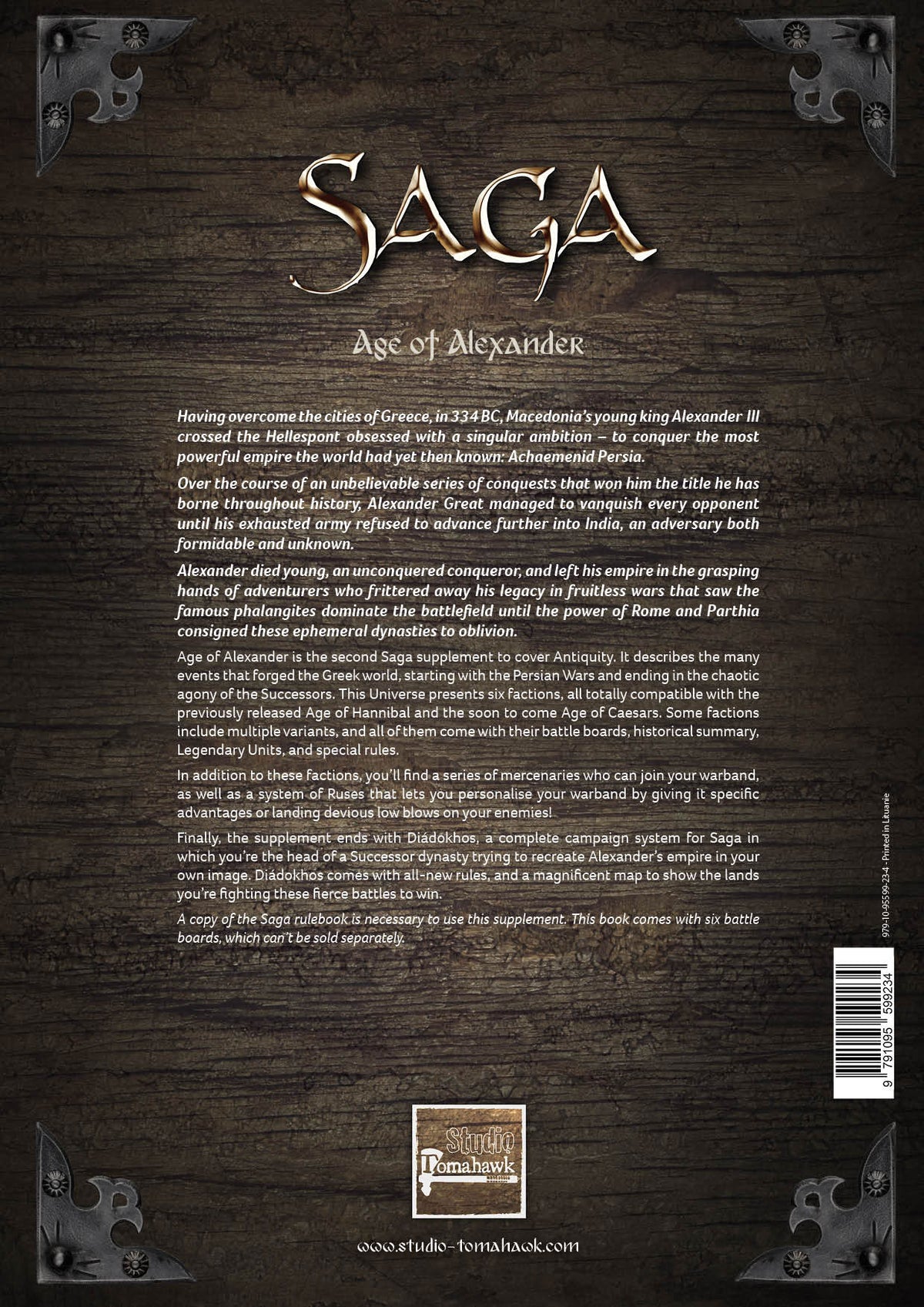 Age of Alexander is the second SAGA supplement to cover Antiquity. It describes the many events that forged the Greek world, starting with the Persian Wars and ending in the chaotic agony of the Successors. This Universe presents six new faction, all totally compatible with the previously released Age of Hannibal and the soon to come Age of Caesars. Some factions include multiple variants, and all of them come with their Battle Boards, historical summary, Legendary Units and Special Rules.