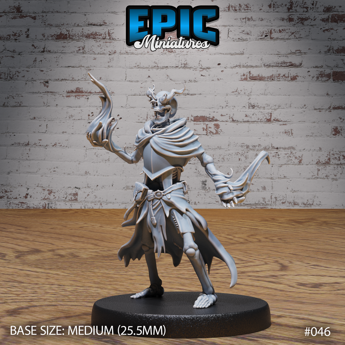 One 3d printed Skeleton Army Sorcerer, with base in 32mm scale. Other scales available including 28mm. Medium Size.