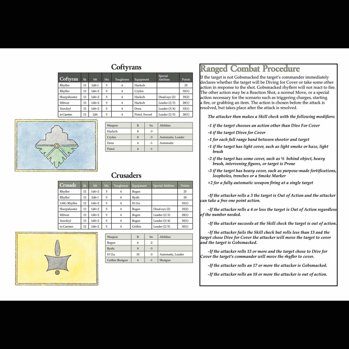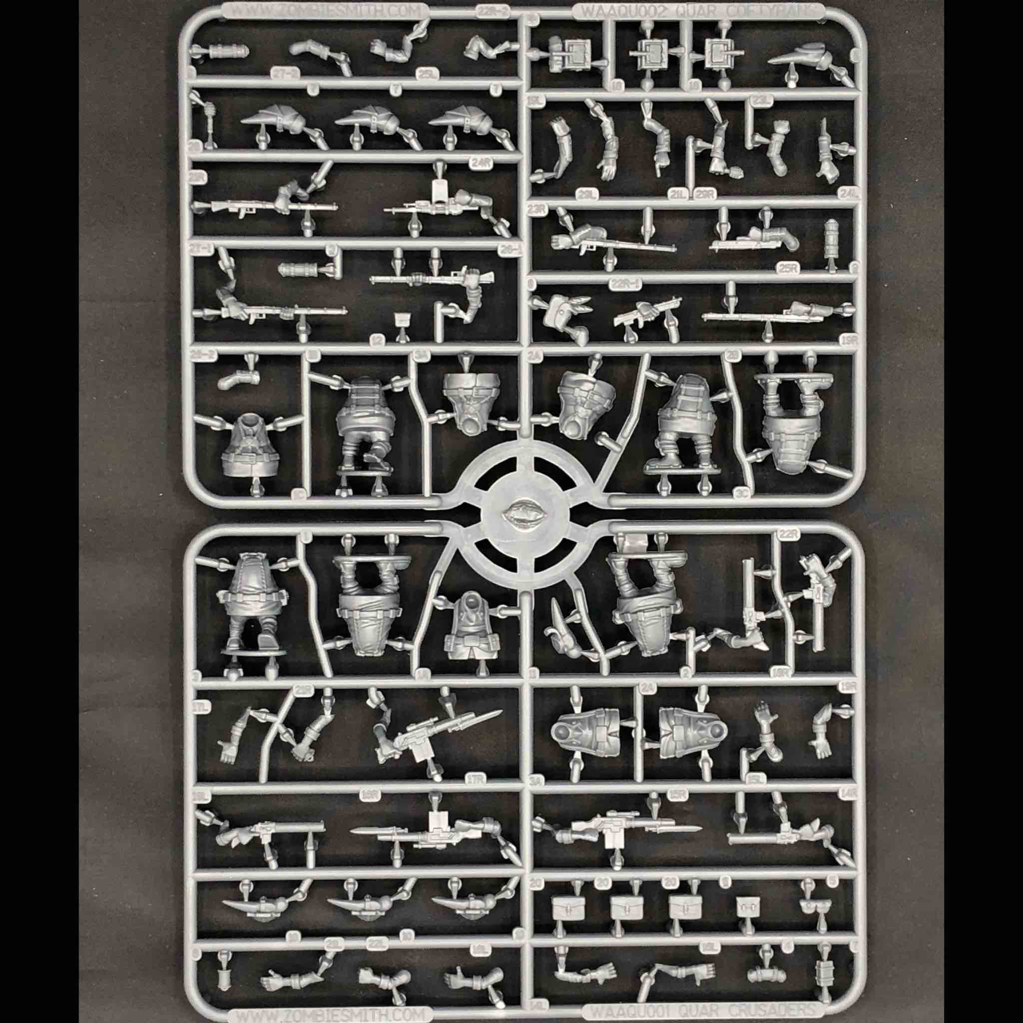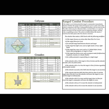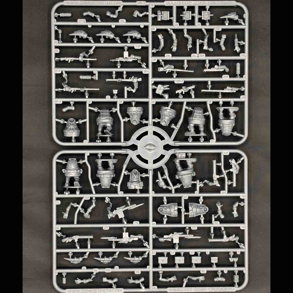 This is a two-player game that features 24 hard plastic Quar (12 Crusaders and 12 Coftyrans), 24 hard plastic dual-use bases, 10 activation cards, 6 D6 dice, and a 48 page rulebook. There is also a selection of cut-out terrain on the box sides to help bring your battlefield to life!