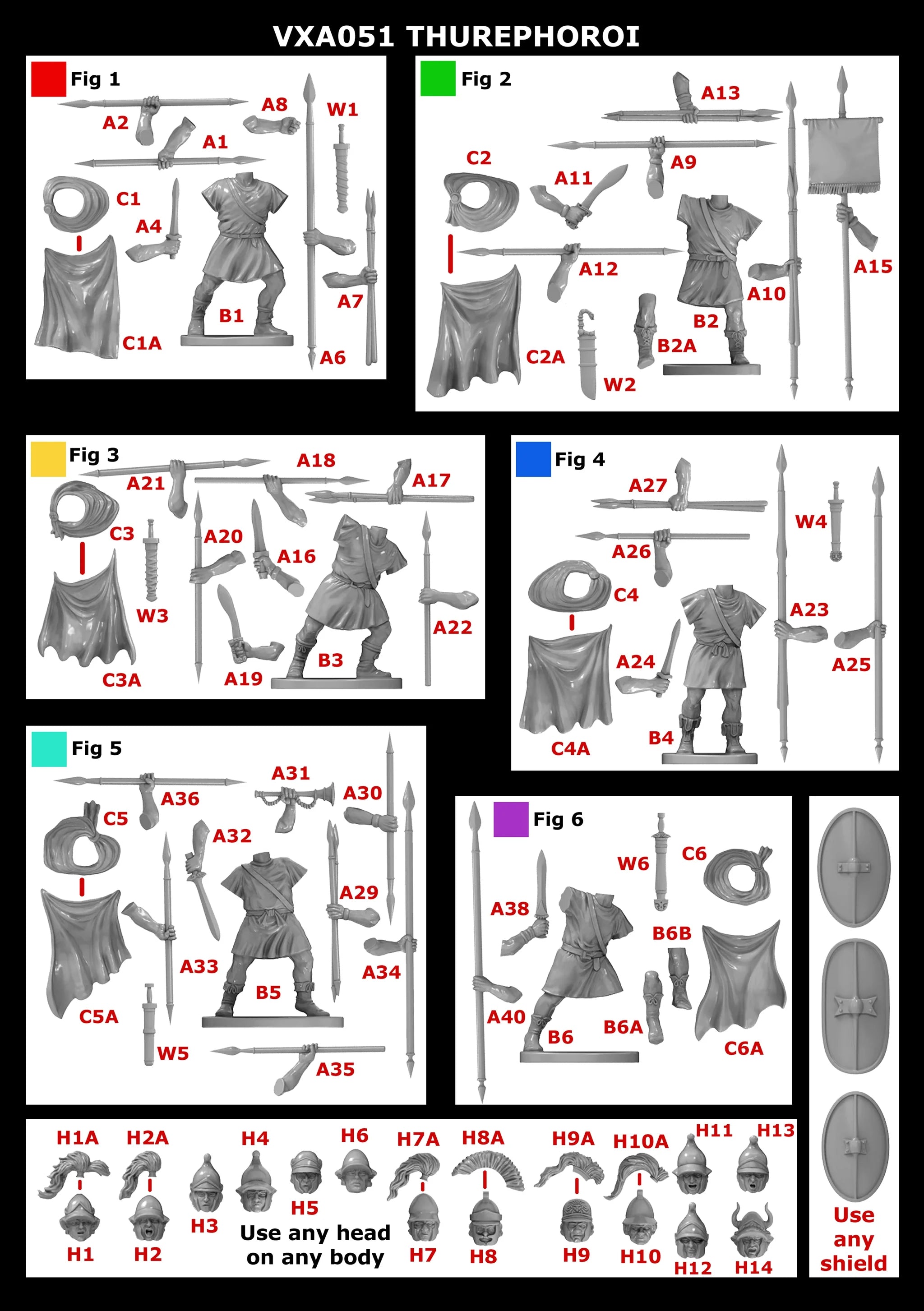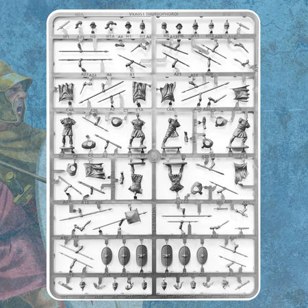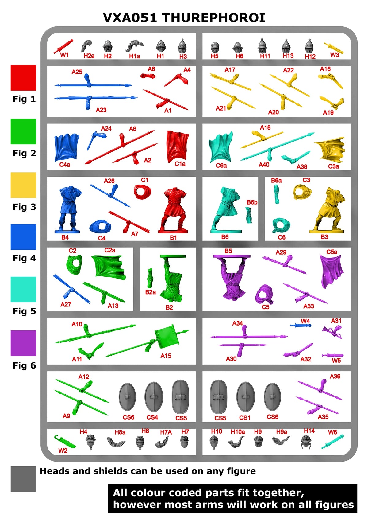 - There are 36 Long thrusting spear options held in the left shield hand, enough for all figures in the set. If you do want to arm your Thurephoroi with thrusting spears in the right hand you can use them from the Greek hoplite set which has plenty of extras.