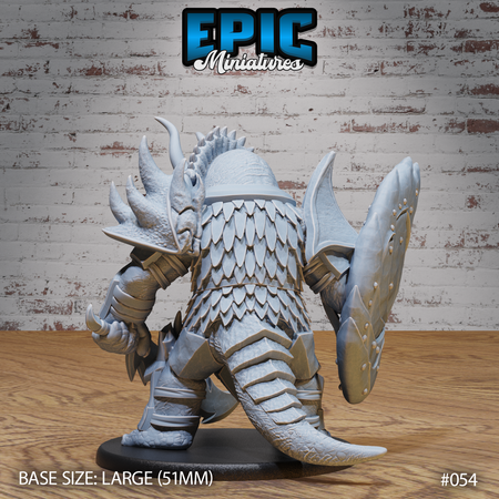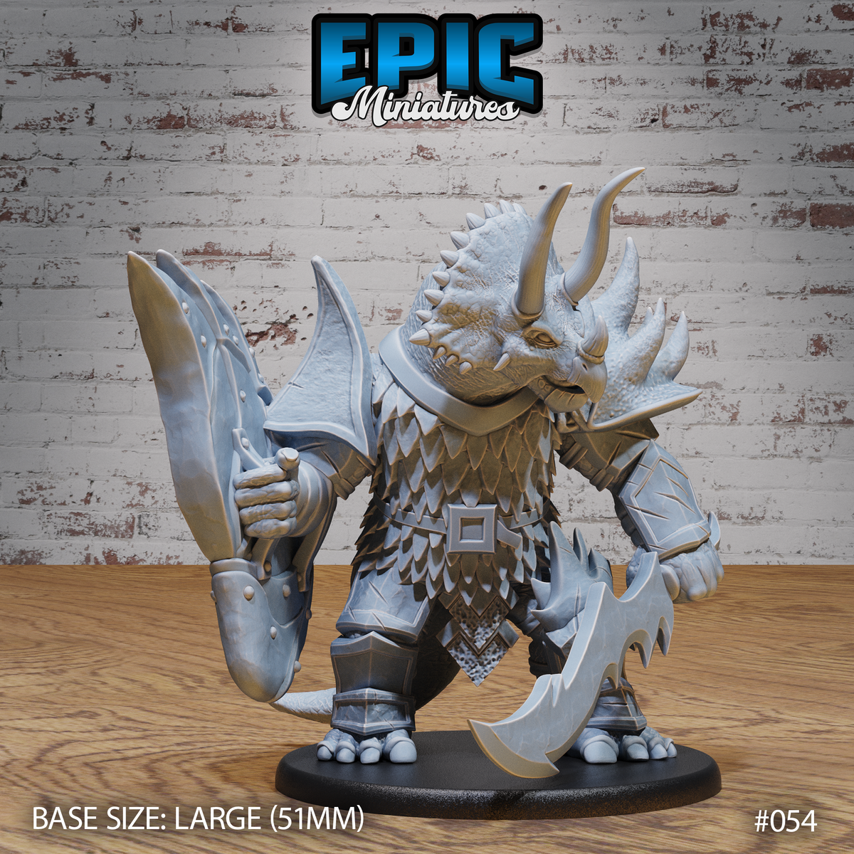 One 3D printed Triceratops Folk Warrior with base in 32mm scale. Other scales available including 28mm. Large Size.