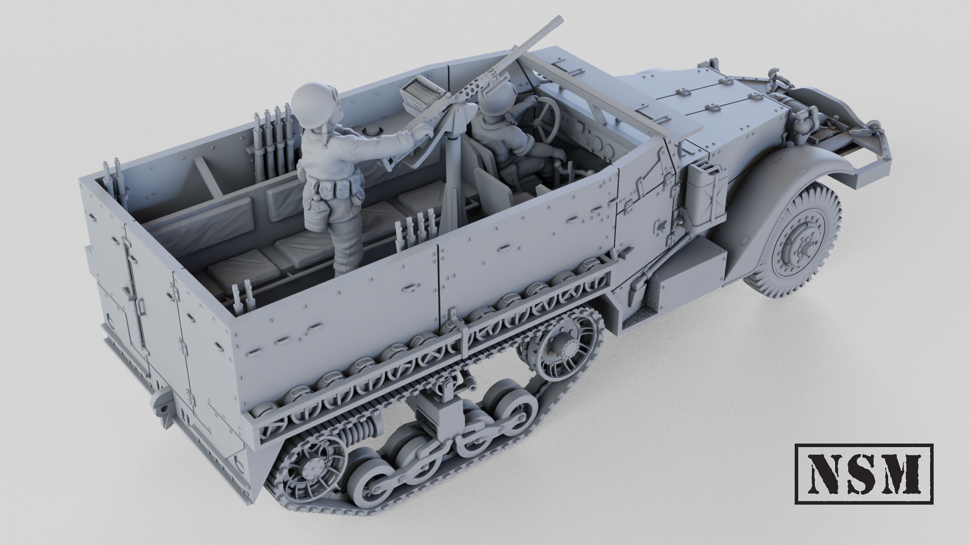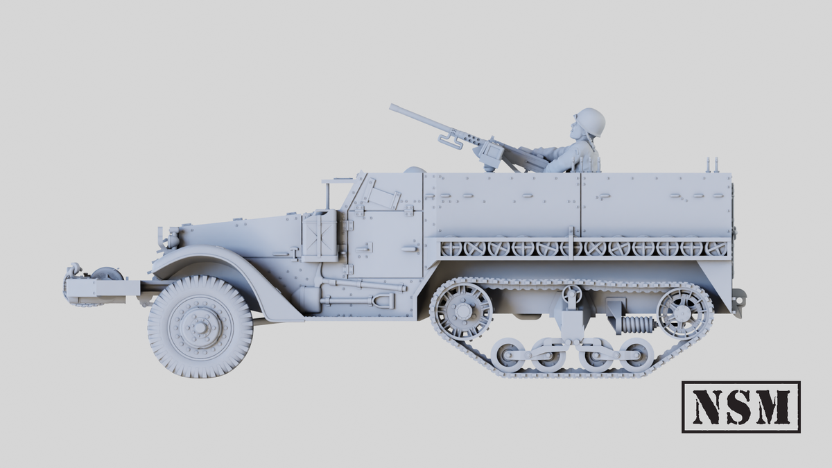 The M3 halftrack was derived from the M2 and was commonly narmed with a 50 cal heavy machine gun.