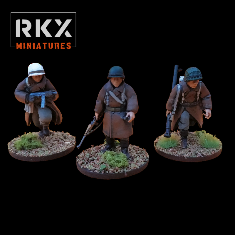 3D Printed 3 man US Army HQ in greatcoats. Includes three miniatures and bases. Scale 1/56 28mm.