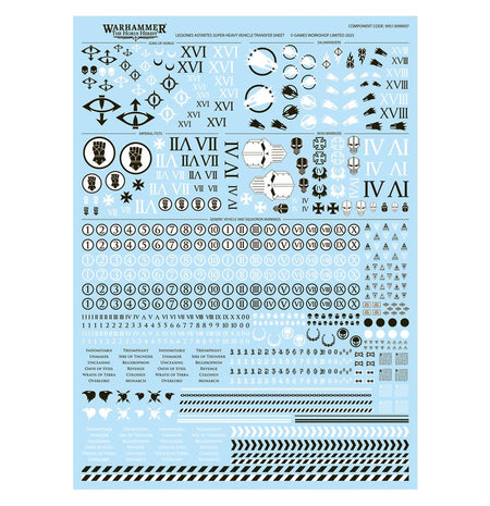 This kit is supplied with 1x Legiones Astartes Super-Heavy Vehicle Transfer Sheet, containing 718 high-quality waterslide transfers to decorate your miniatures. There is Legion iconography for the Sons of Horus, Imperial Fists, Iron Warriors, and Salamanders, along with generic vehicle and squadron markings, numerals, laurel wreaths, and hazard stripes.