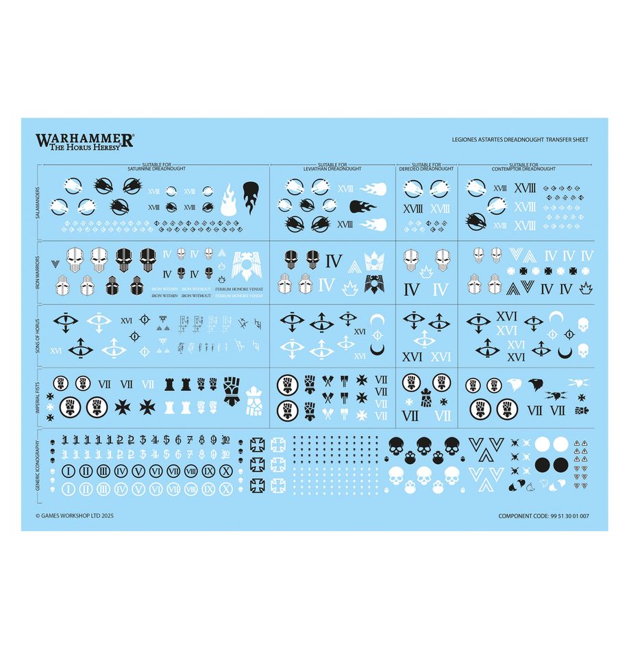 This kit comprises 213 plastic components, 1x Citadel 100mm Round Base, and 1x Horus Heresy Dreadnought Transfer Sheet containing 528 high-quality waterslide transfers – featuring Legion iconography for the Sons of Horus, Imperial Fists, Iron Warriors, and Salamanders – to decorate your miniatures.