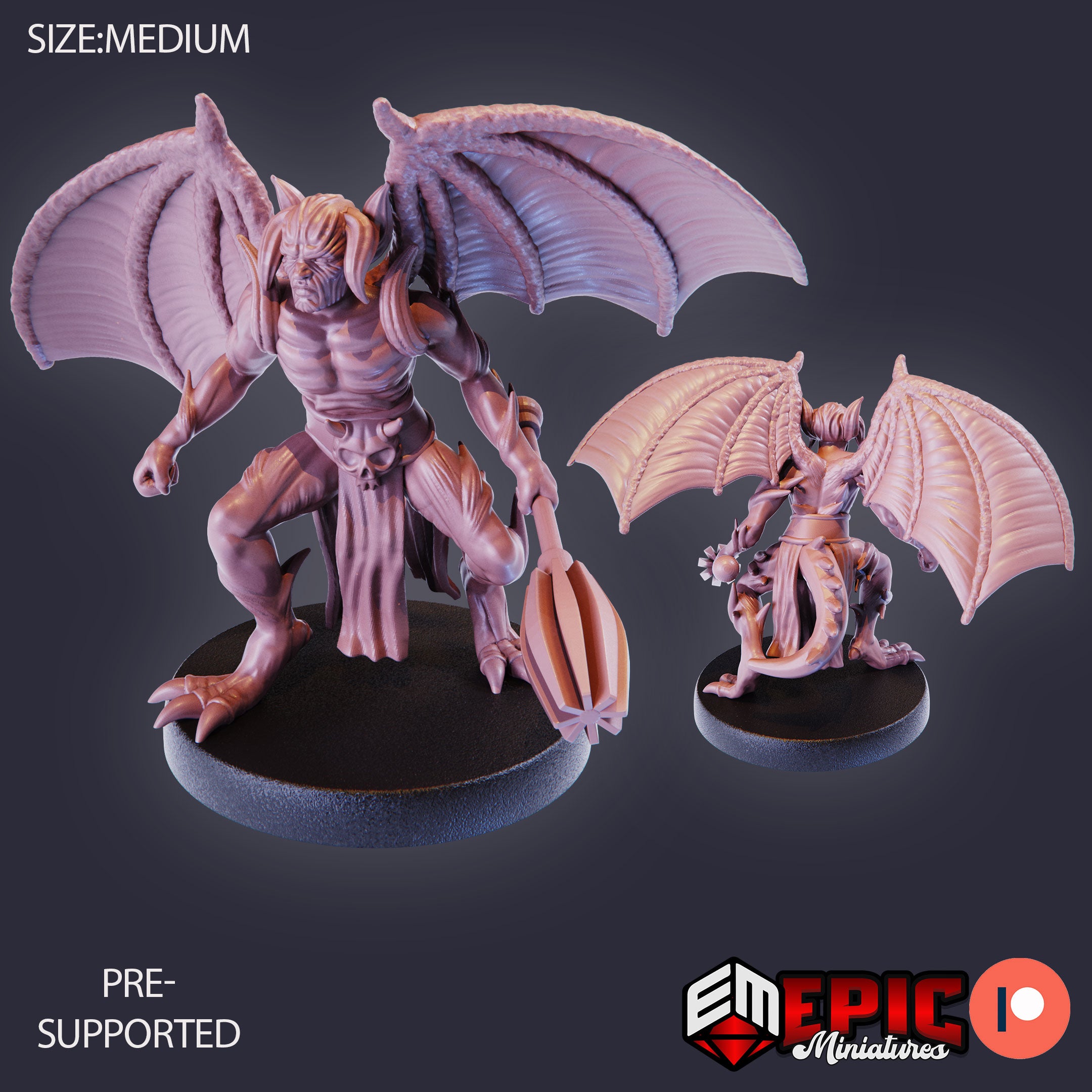 One 3D printed Winged Devil Army Mace with base in 32mm scale. Other scales available including 28mm. Medium Size.